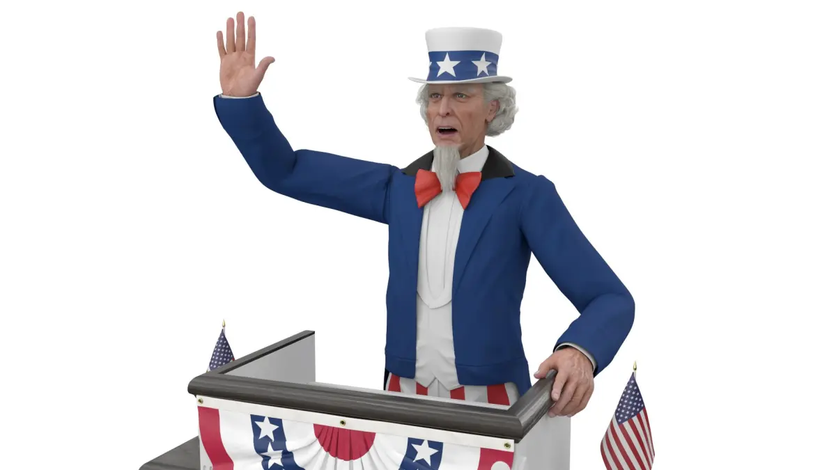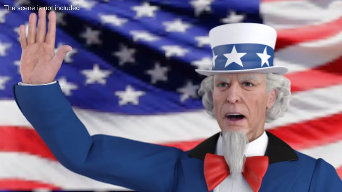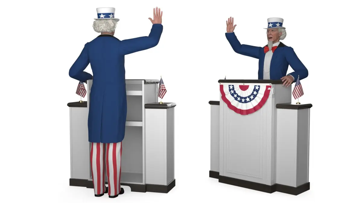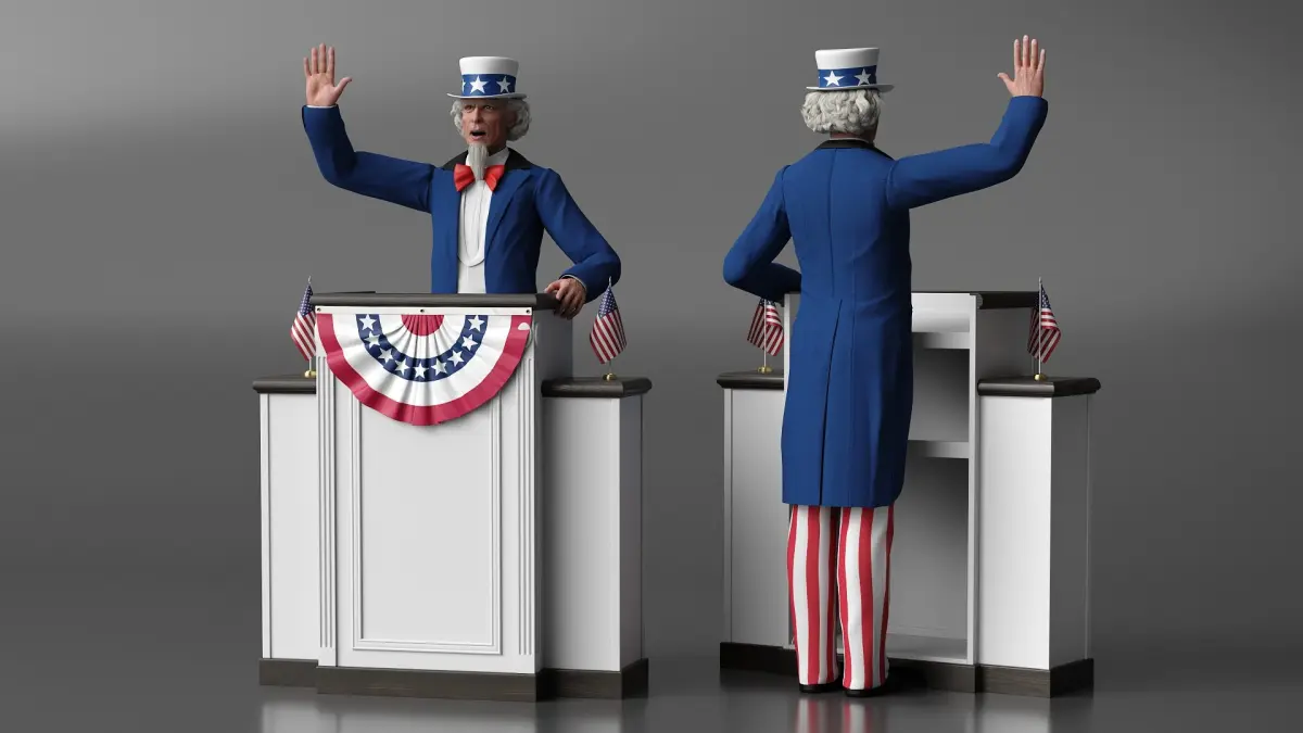 Uncle Sam Speaking Behind USA Flag Podium is a three-dimensional model of iconic figure often associated with the United States, frequently used in patriotic themes and imagery.