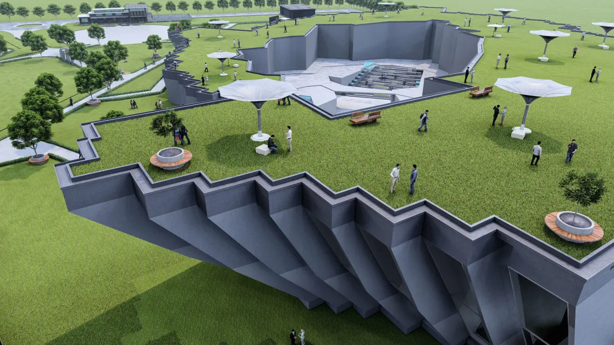 Ammenities : Amphithreater at center of the MuseumMuseum Rise from one side and lower on the other side
