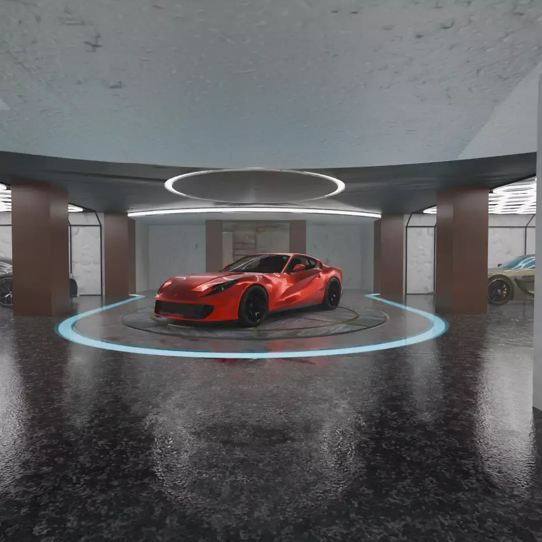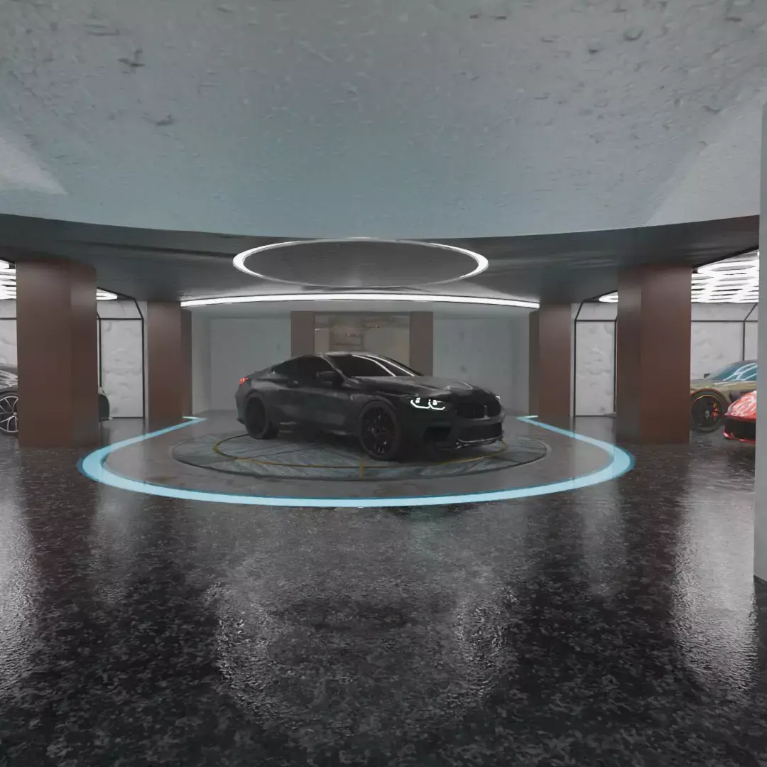 A luxurious high-end garage unfolding in an underground space reminiscent of a secret hideout.Add an extraordinary sense of luxury to your creations.