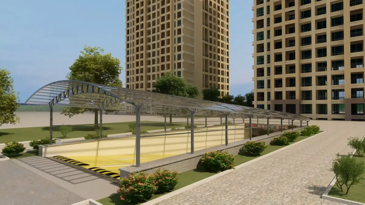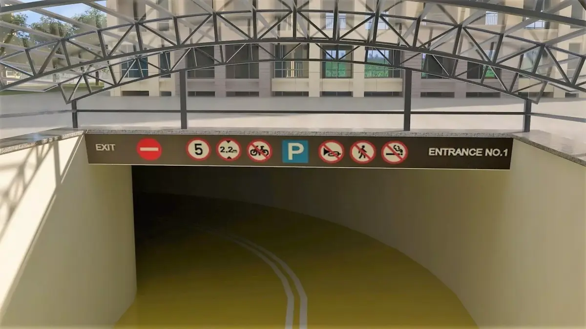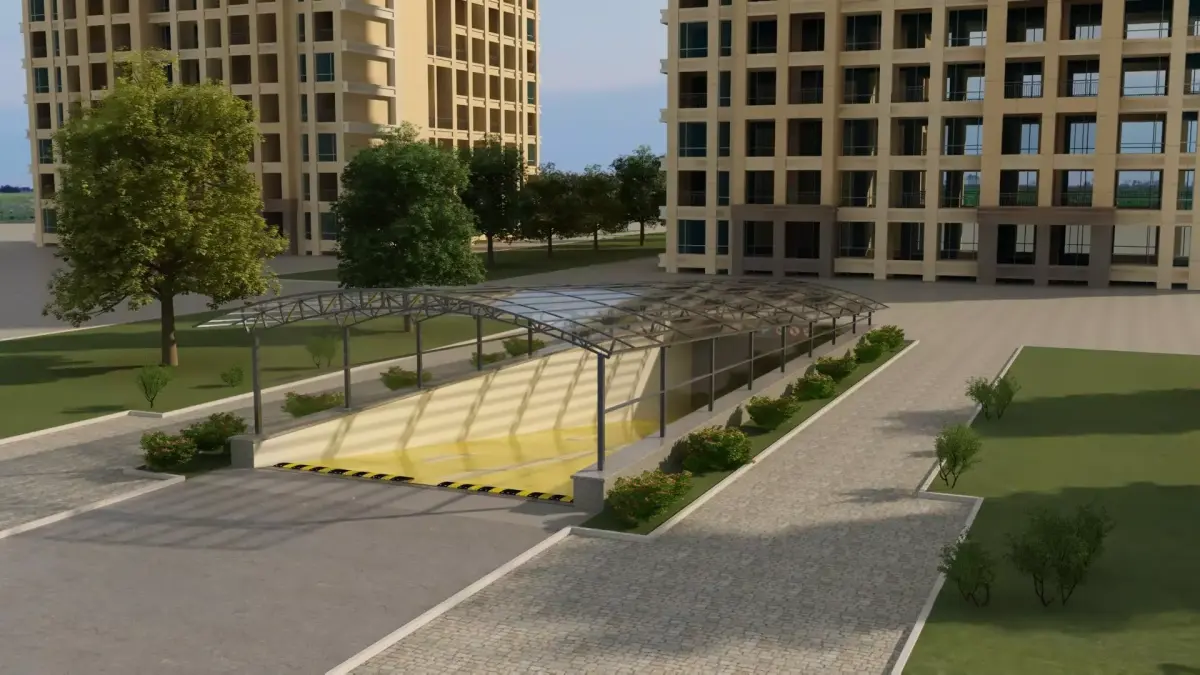 Underground parking entrance/shelter (2 roof models) with a speed bump and an apartment building. Greenery is vray proxy (3 vrmesh-files).
