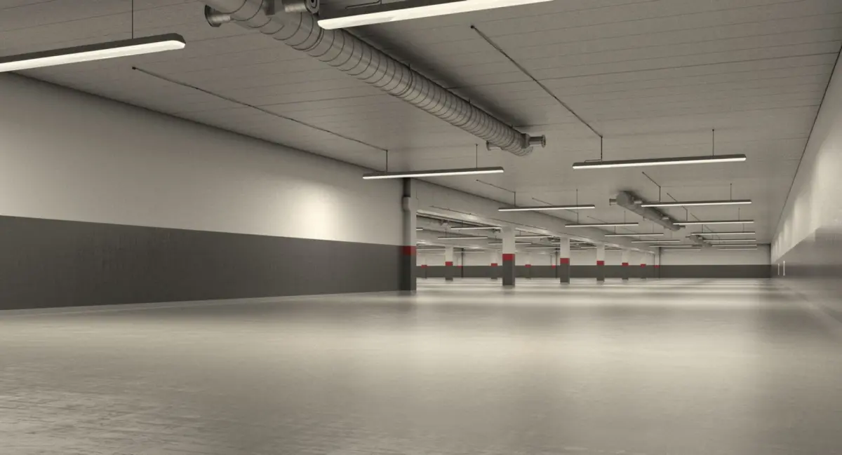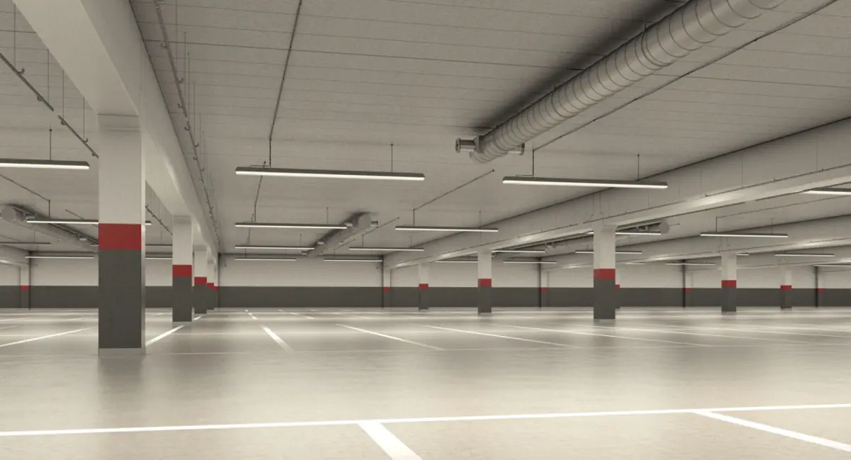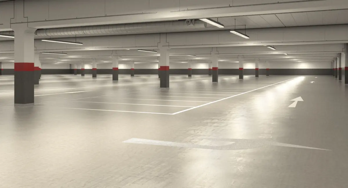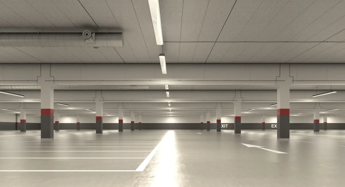 A highly detailed 3D model scene of an underground parking garage / parking lot.