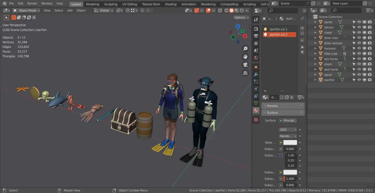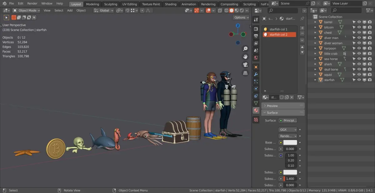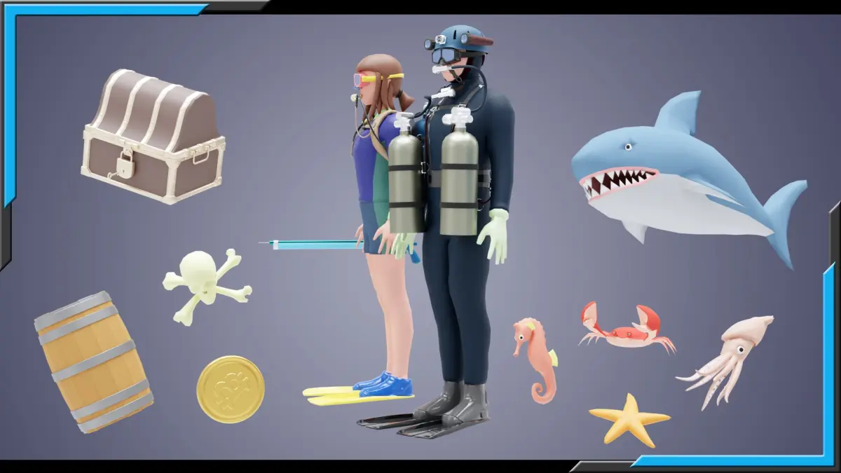 Squid, starfish, crab, shark, seahorse, diver man, diver woman, tresure chest, harpoon, bitcoin, skull, barrel.