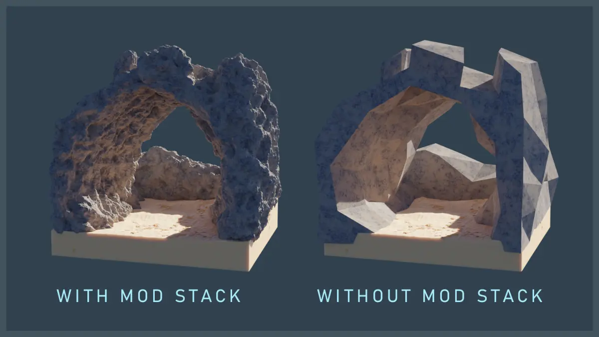 The entire cave object contains only 238 vertices, and uses a non-destructive modifier stack for detailed texture. You can change or add rocks very easily, just copy the modifiers to any mesh and it will get a realistic rocky texture. The preview images show the rock object with and without its modifier stack. The shape of the cave is completely customizable, so you can edit, add, and remove vertices without losing any detail.
