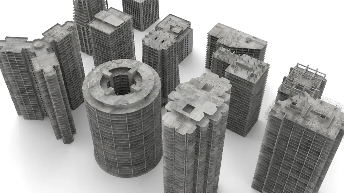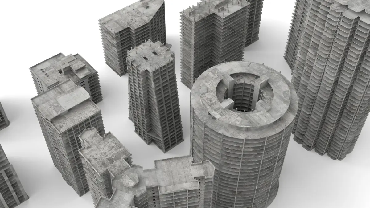 A set of 12 models, suitable for depicting under construction, unfinished, or abandoned buildings. All are primarially constucted from concrete. Scaffolding, barriers and and exposed rebar is included in some of the models to add detail. They use transparent textures.Tallest building is 138m, shortest is 39m. Footprints vary from around 25m on the shortest dimension and up to 70m on the largest.