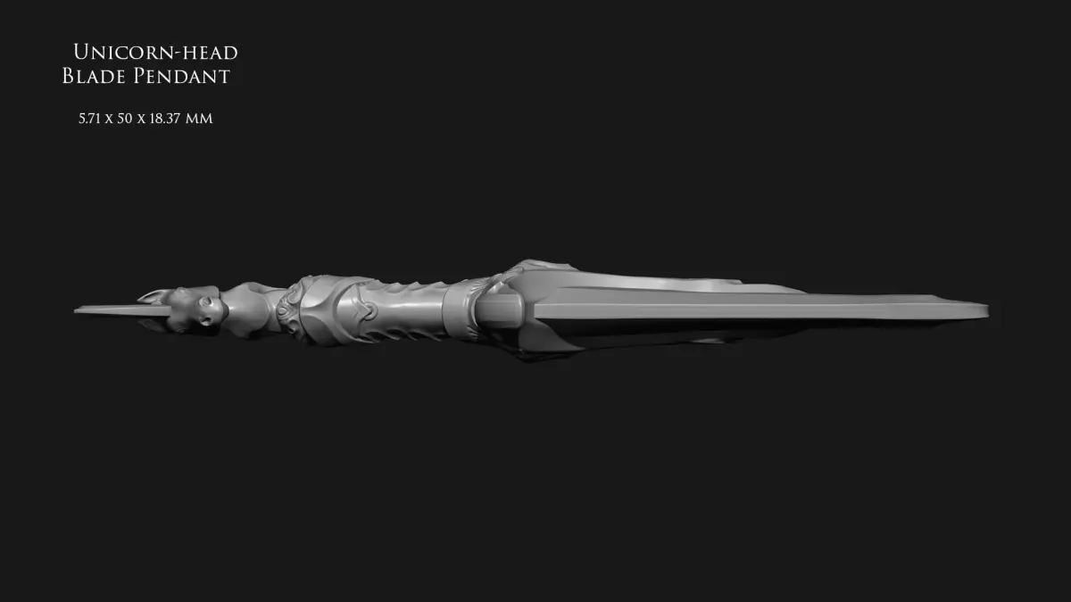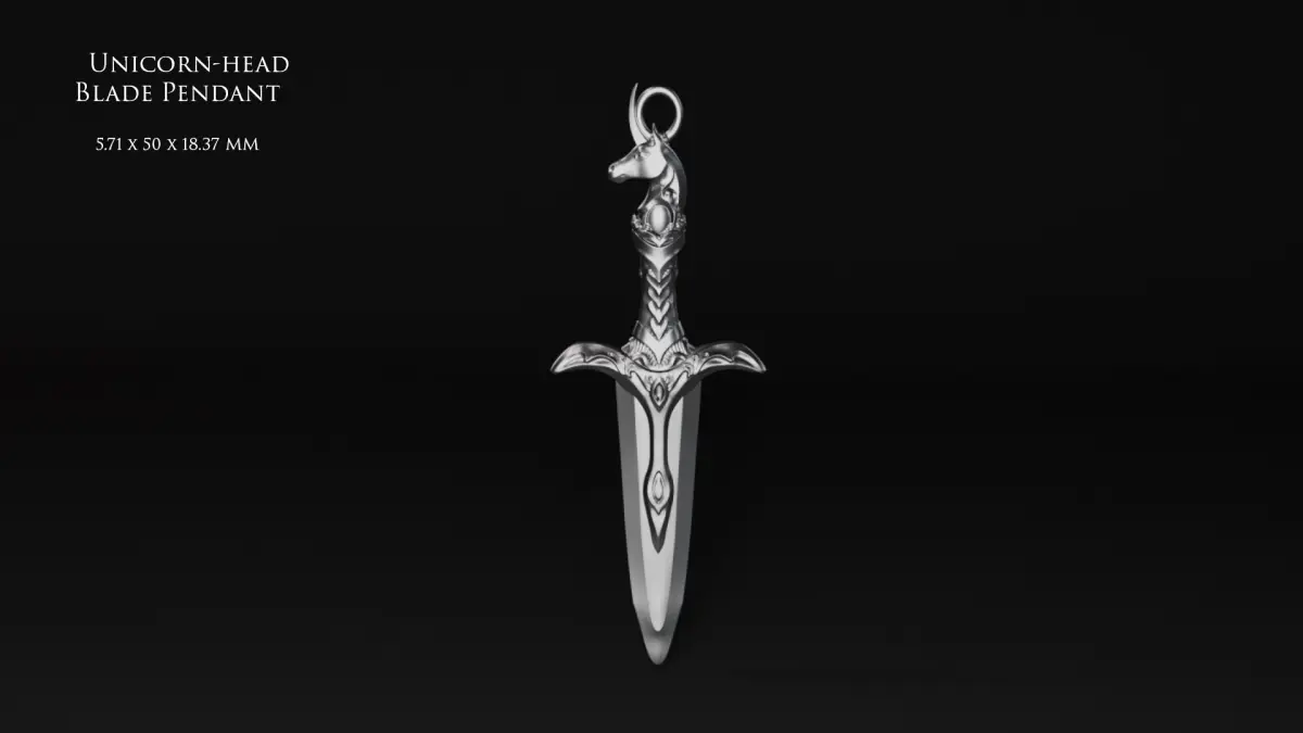 A fantasy-inspired dagger pendant topped with a unicorn head. Modeled in ZBrush, made for 3D printing purposes.