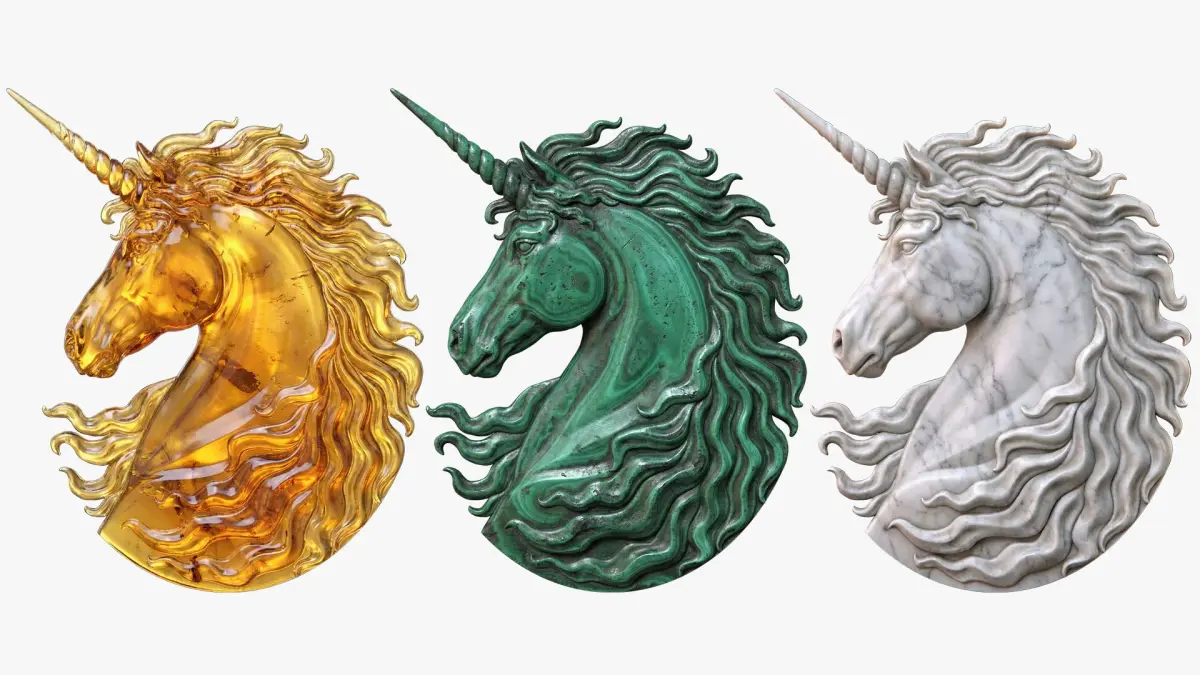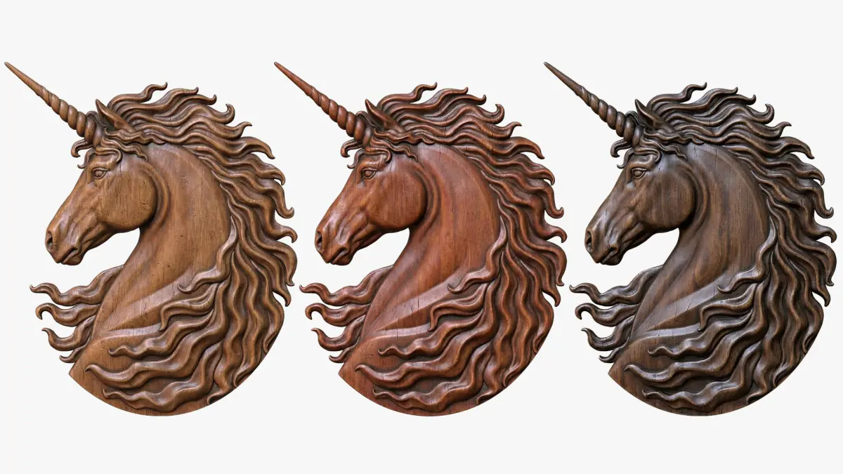 You can use the 3D model for digital rendering to obtain high-quality images of the Unicorn's relief. You can see several examples of the 3D model's visualization in various materials - wood, metals, and minerals, including marble.