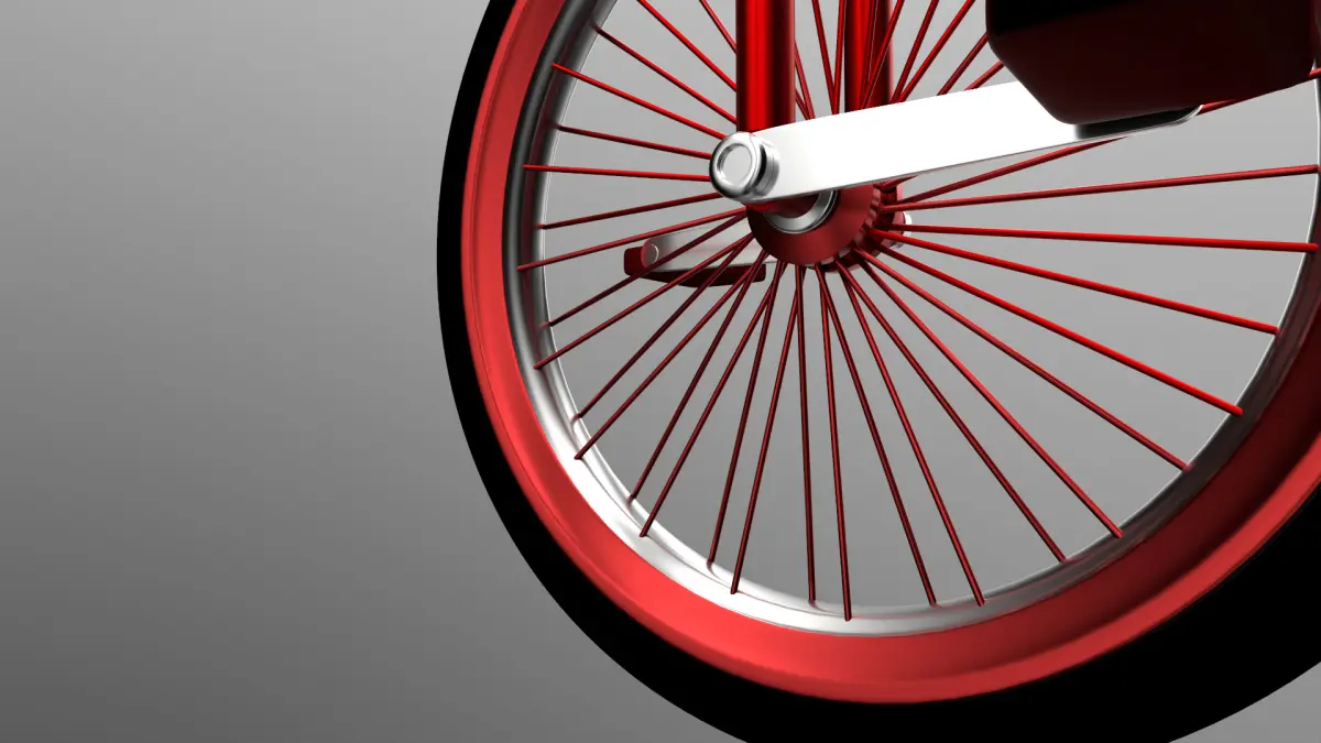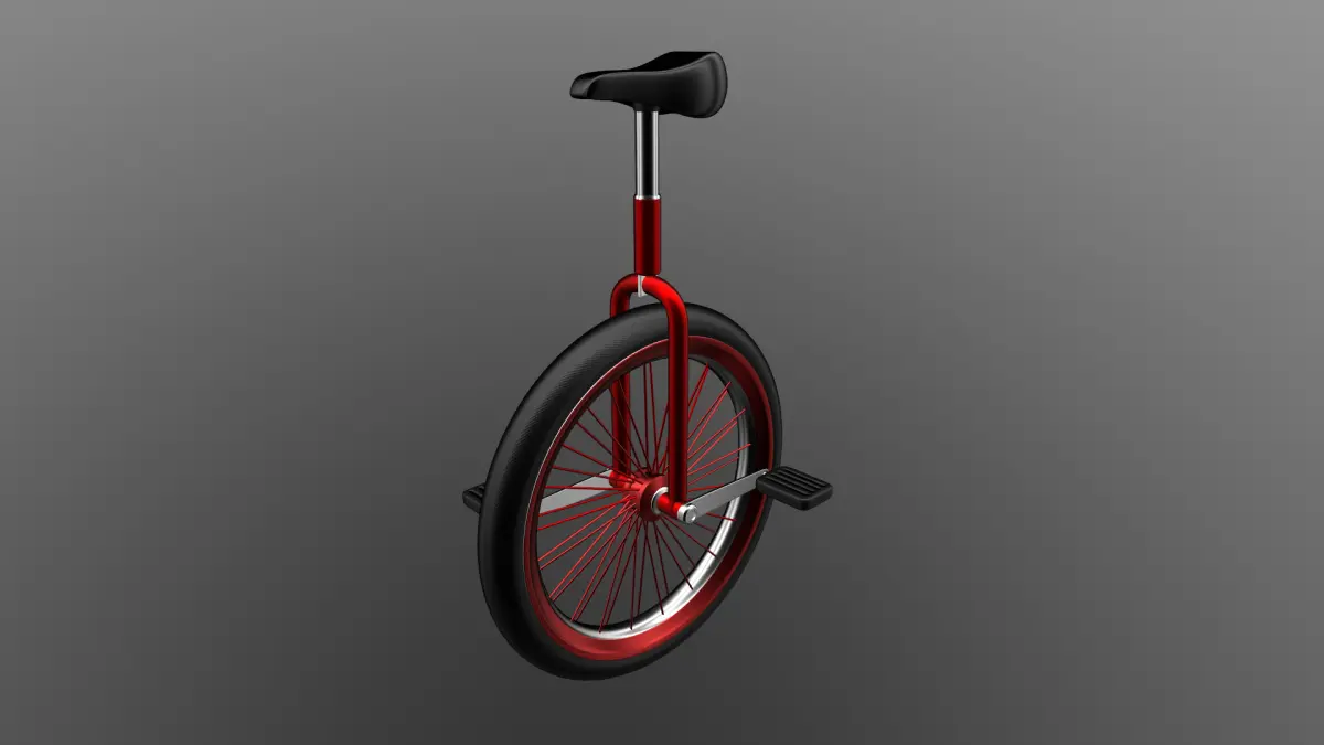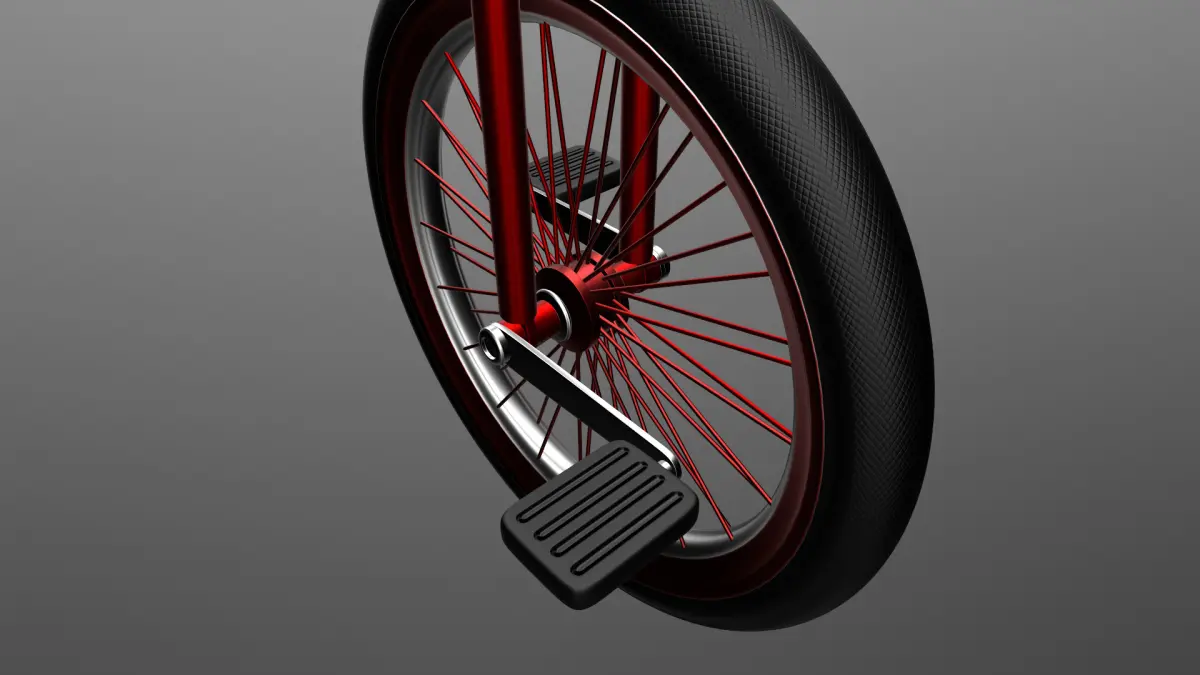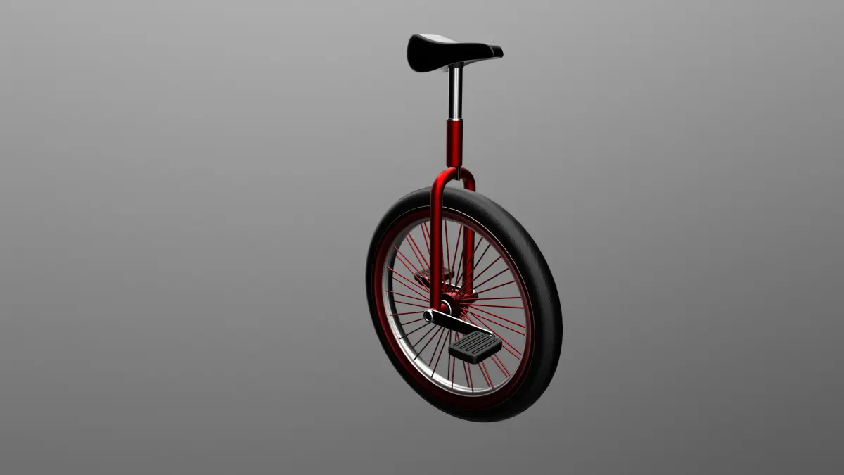 A vibrant red unicycle designed for kids, with a sleek metallic finish and a comfortable padded seat, perfect for young riders to practice their balancing skills in the current timeline.