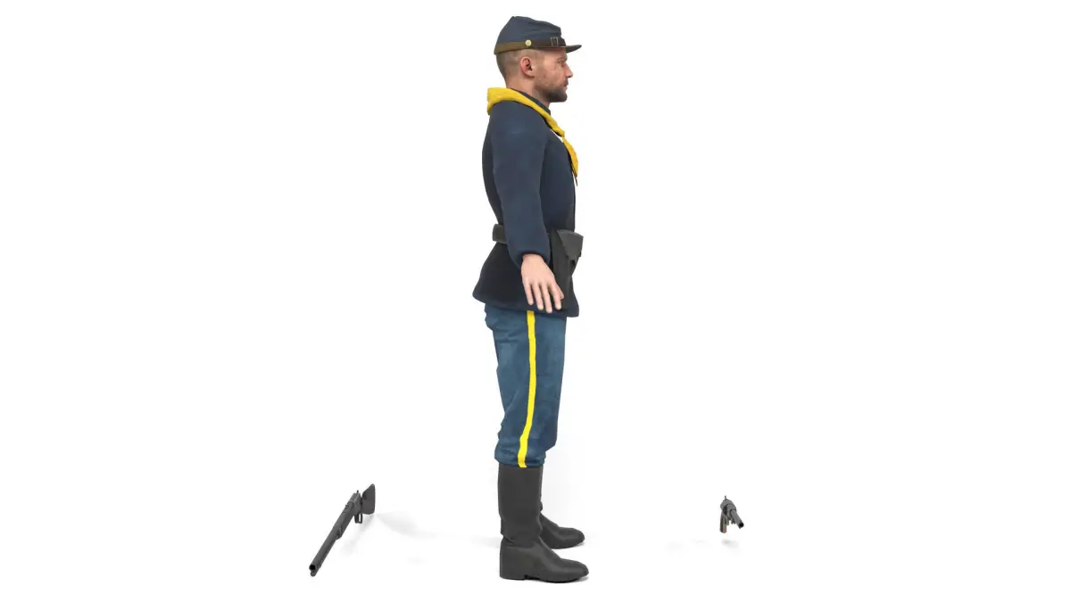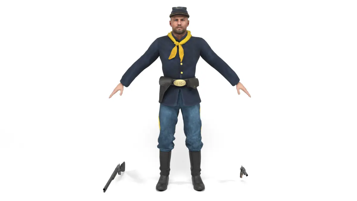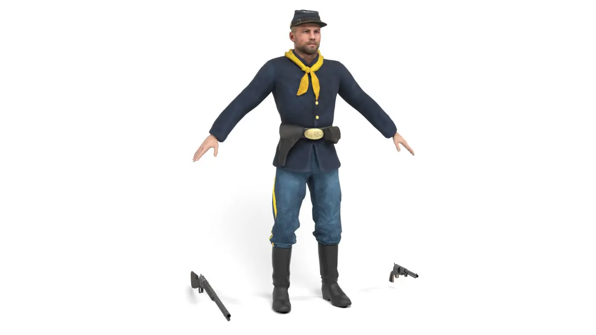 3D model of a Union soldier (American Civil War in the United States). Weapons included. The model includes bones and several animations. Model ideal to be used in games, advertising and video production. Low-poly models to be used easily in any project.