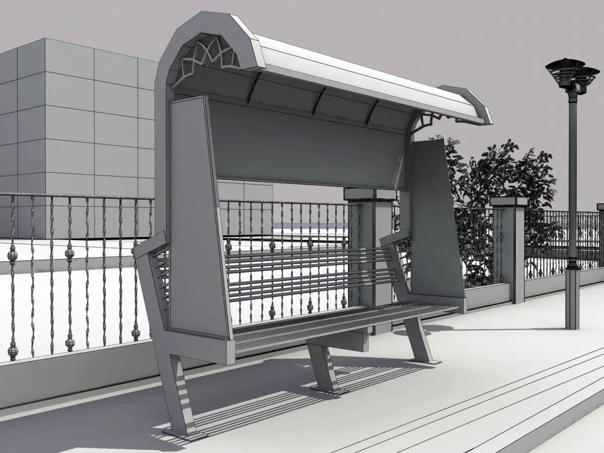 Exterior bench with unique design with street enviroment around like trees and lamps,,available in 3ds. and fbx. and obj.Enjoy,,