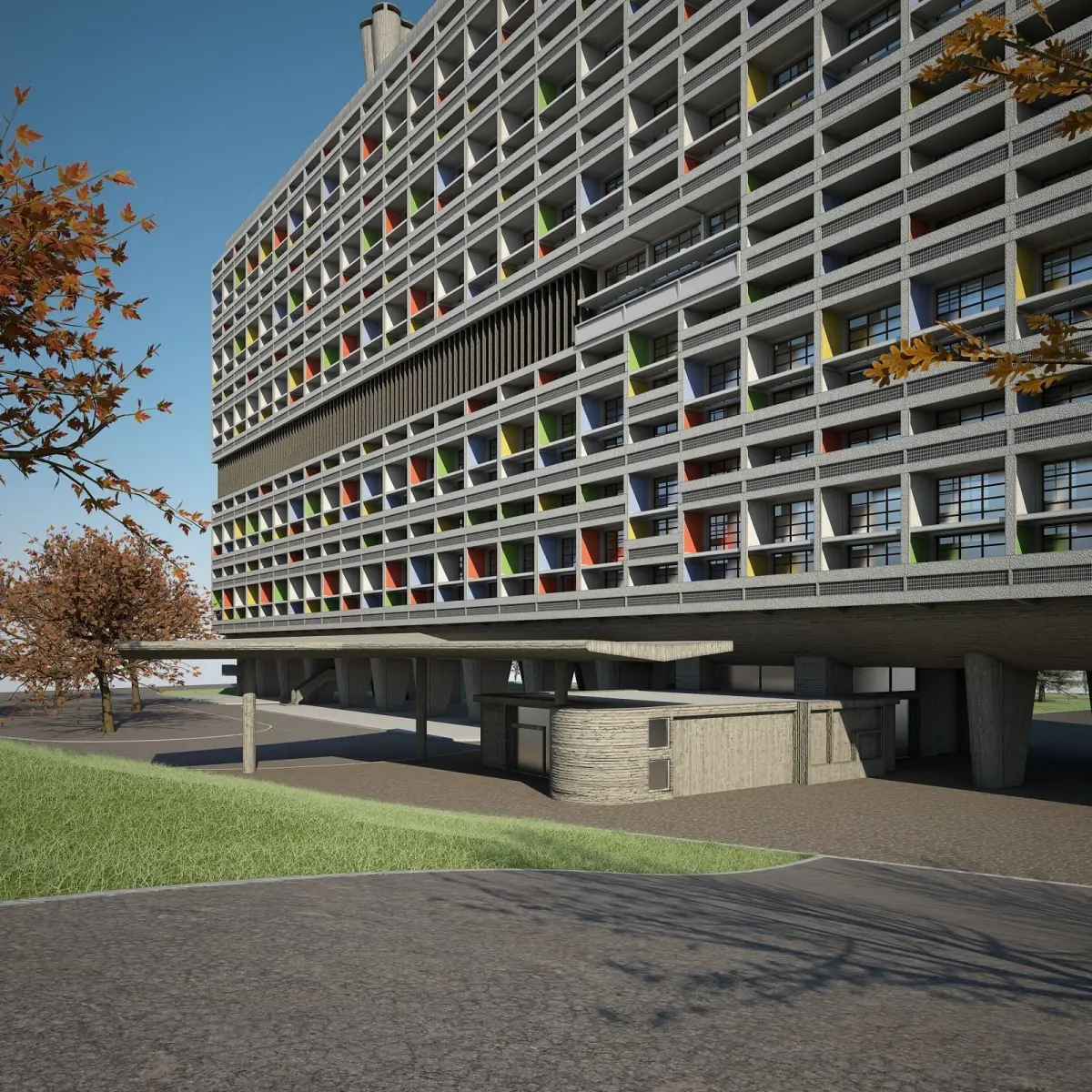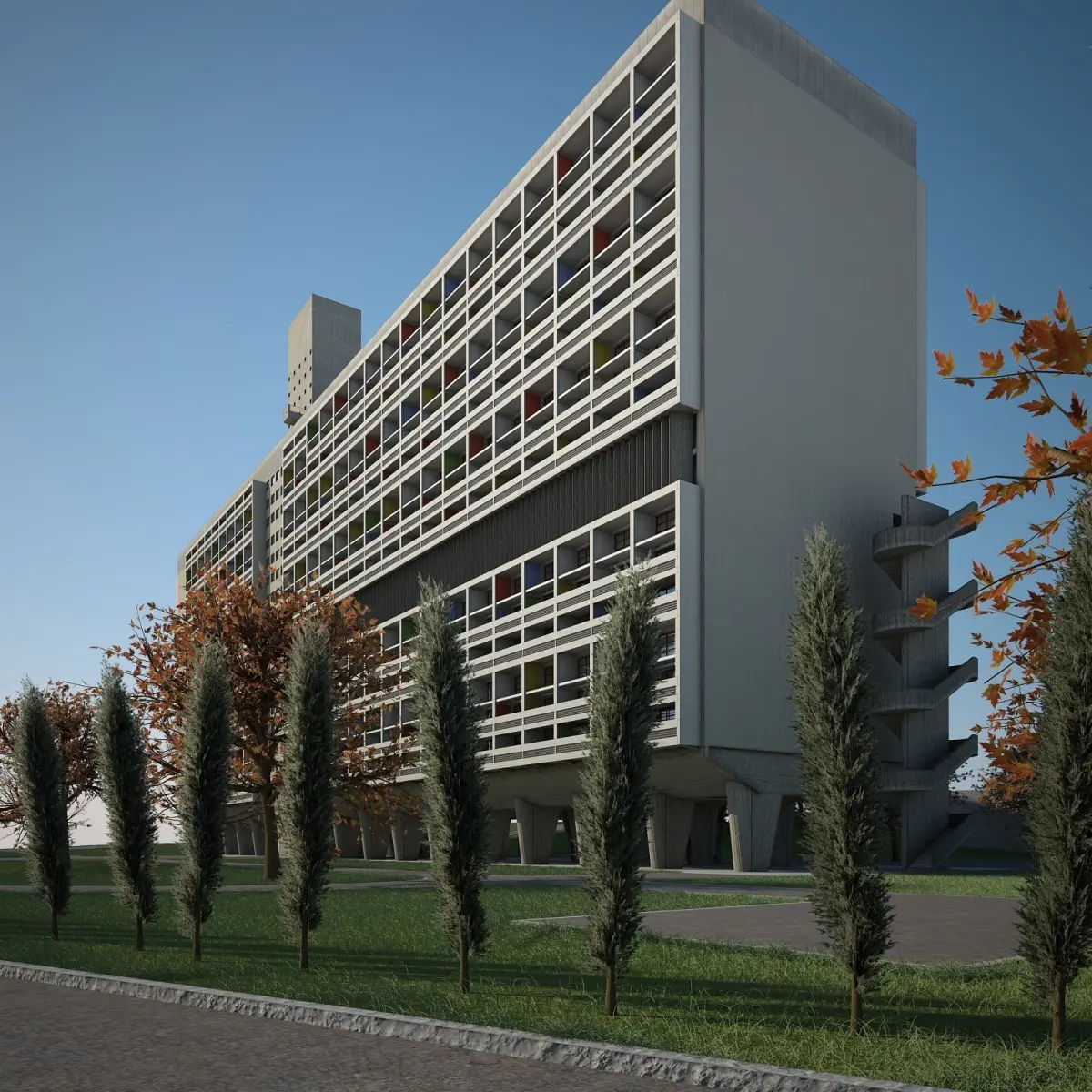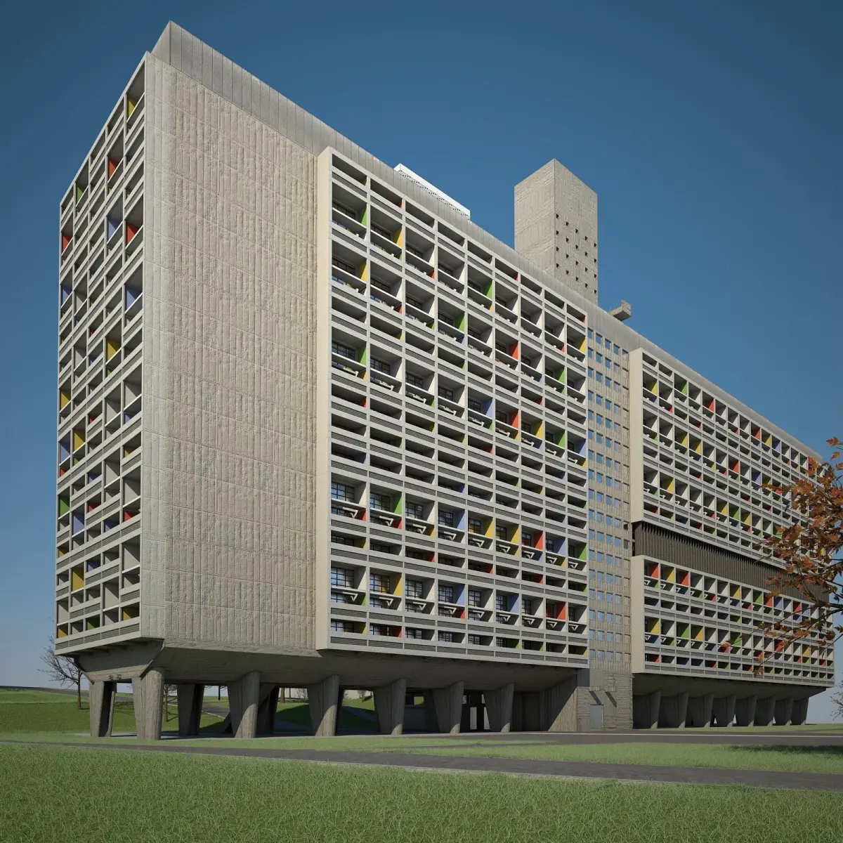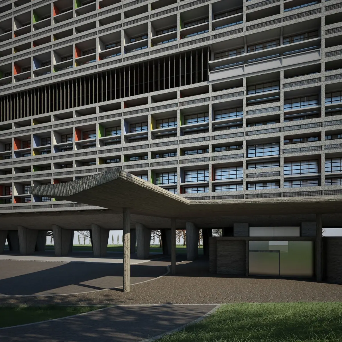 Highly detailed 3D model of Le Corbusier's Unit d'Habitation de Marseille.