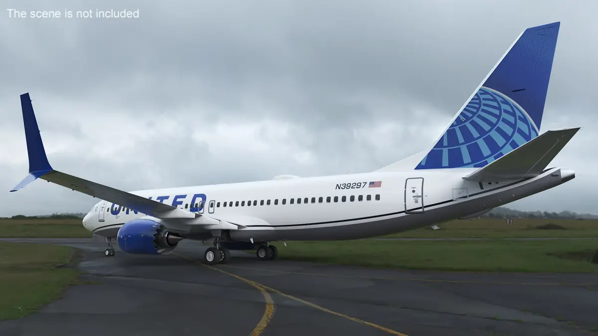 United Airlines Boeing 737 Max 8 Rigged has a detailed interior. Chassis can be extended. The pose with extended chassis on the render images is an example and can be easily recreated using rig, it is not initially included into the product.