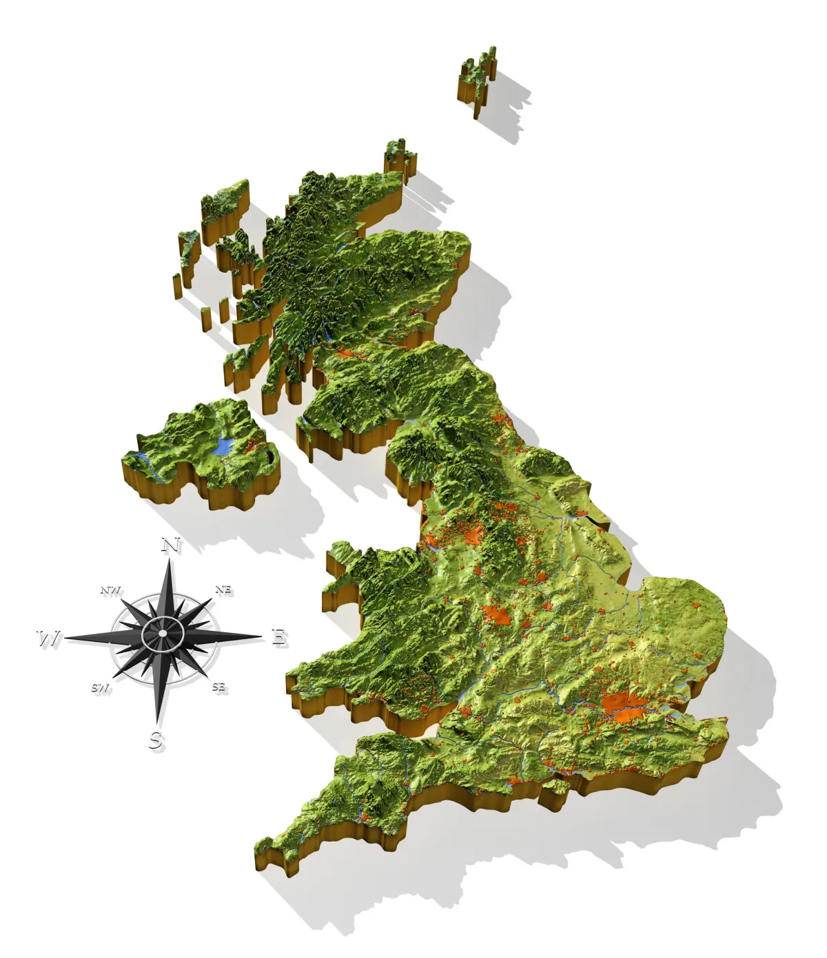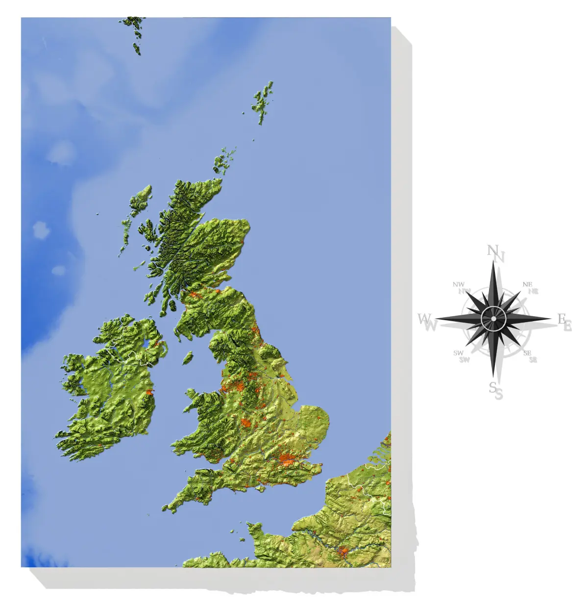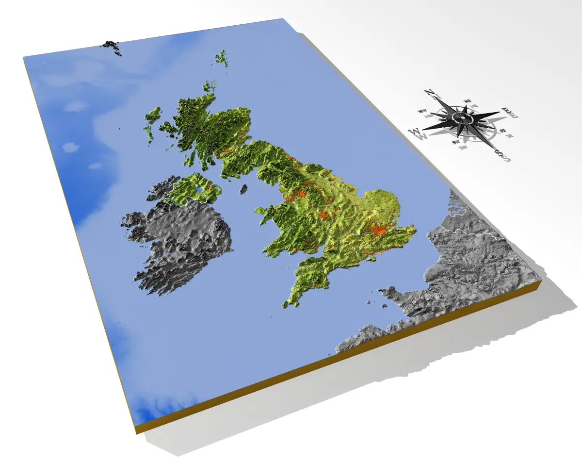 The set contains three models: a relief map of the United Kingdom with surrounding area, a separate relief cutout of the state area, and a separate plain cutoutof the state outline.