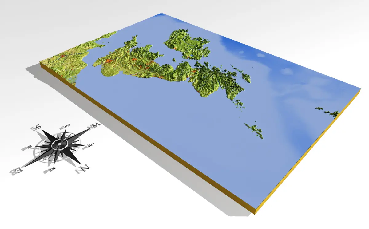 The 3D relief is taken from reprojected NASA shuttle radar topography data, with the elevation exaggerated. The relief is baked into a 740x1100 mesh with 1637648 polys, 820680 vertices (for the main map).