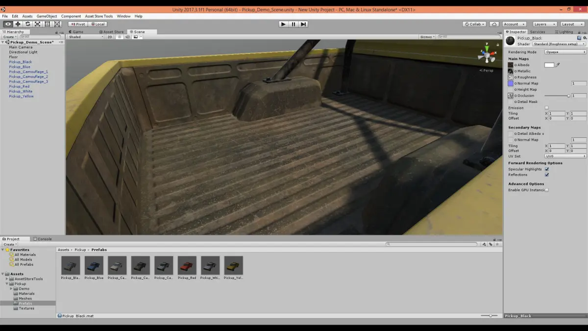 Realistic Vehicle Pack ready to be used in Unity 3D.The model was textured using PBR with 4096x4096 of resolutionThe pack includes 8 differents variation of this vehiclePBR Materials were reconfigured in unity and assinged to each modelPrefab with 0,0,0 position, 0,0,0 Rotation and 1,1,1 scale was made for each variation of the vehicleMore details in this example videohttps://www.youtube.com/watch?v=RJGMio9LjWw