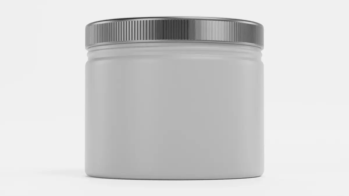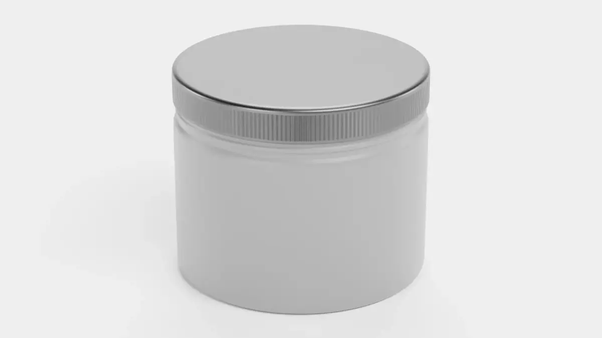 A detailed 3D model of a neutral screw-top container, designed for versatile use in product visualization and packaging mockups. The model features a smooth cylindrical body in a neutral gray finish, with a screw cap for a realistic, production-ready look. This jar container maintains a clean, brand-free surface, allowing easy customization for labeling, logo placement, or color variations. Its proportions and surface detailing are optimized to reflect typical packaging used for nut butters, supplements, cosmetics, or food products.