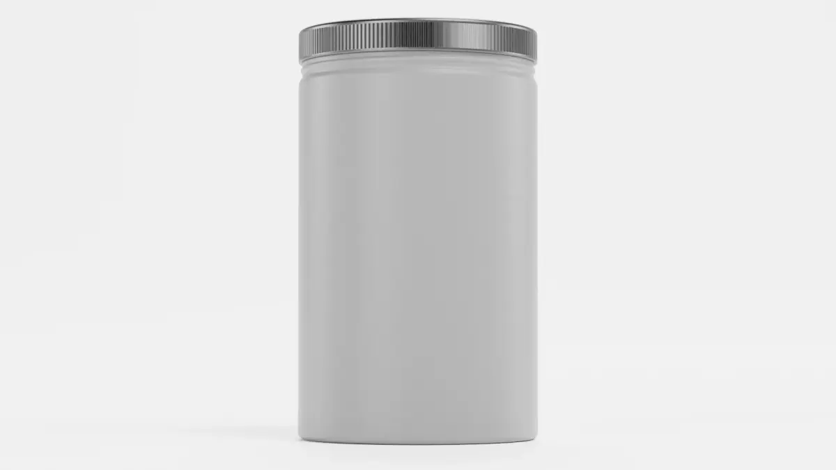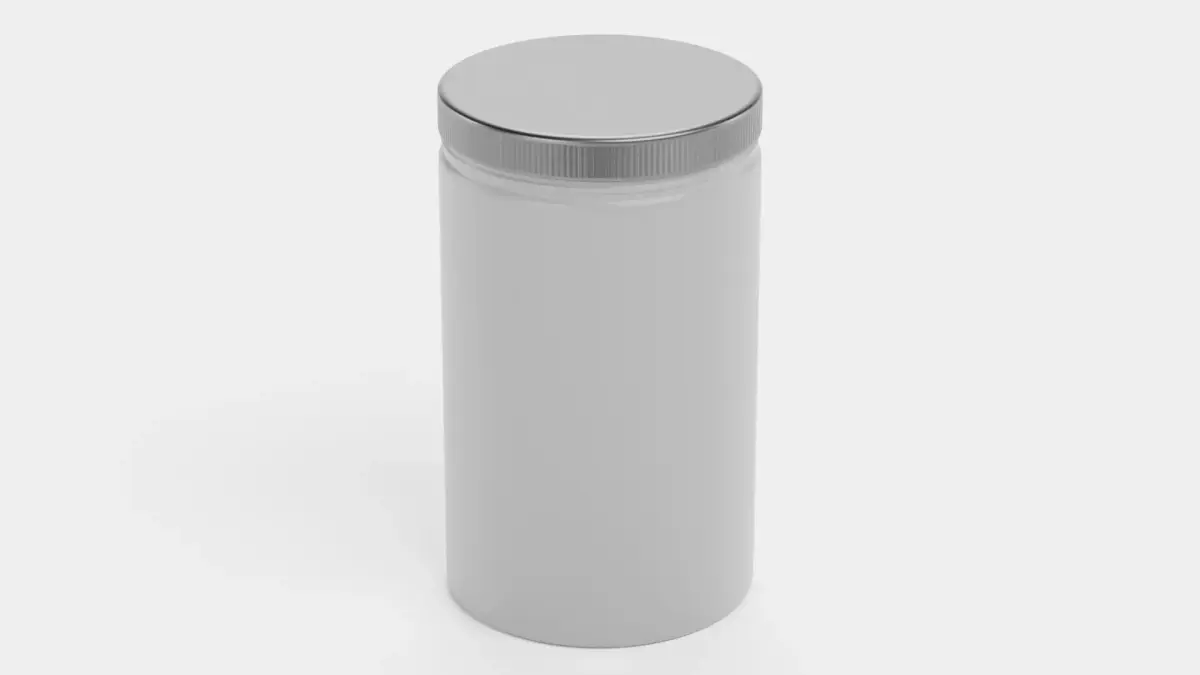 A detailed 3D model of a neutral screw-top container, designed for versatile use in product visualization and packaging mockups. The model features a smooth cylindrical body in a neutral gray finish, with a screw cap for a realistic, production-ready look. This jar container maintains a clean, brand-free surface, allowing easy customization for labeling, logo placement, or color variations. Its proportions and surface detailing are optimized to reflect typical packaging used for nut butters, supplements, cosmetics, or food products.
