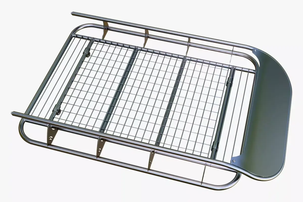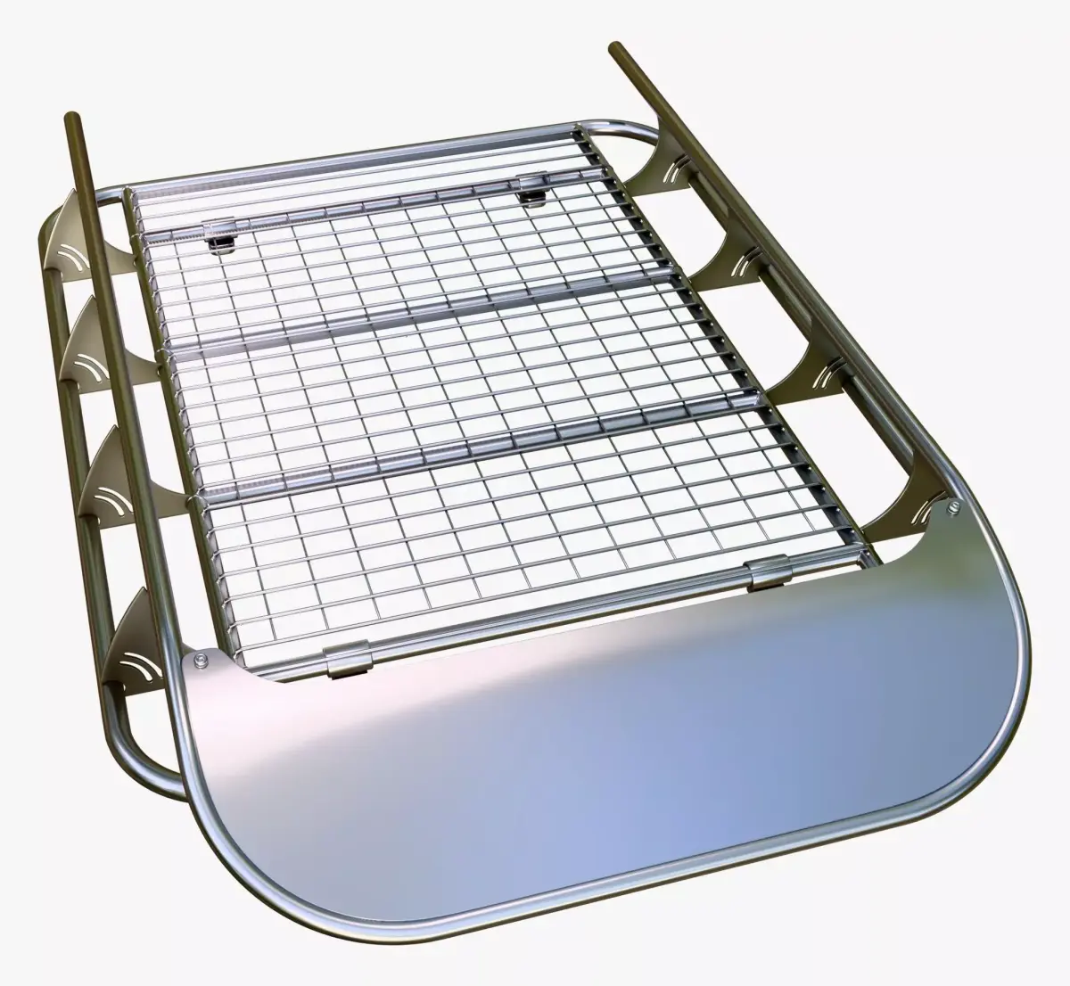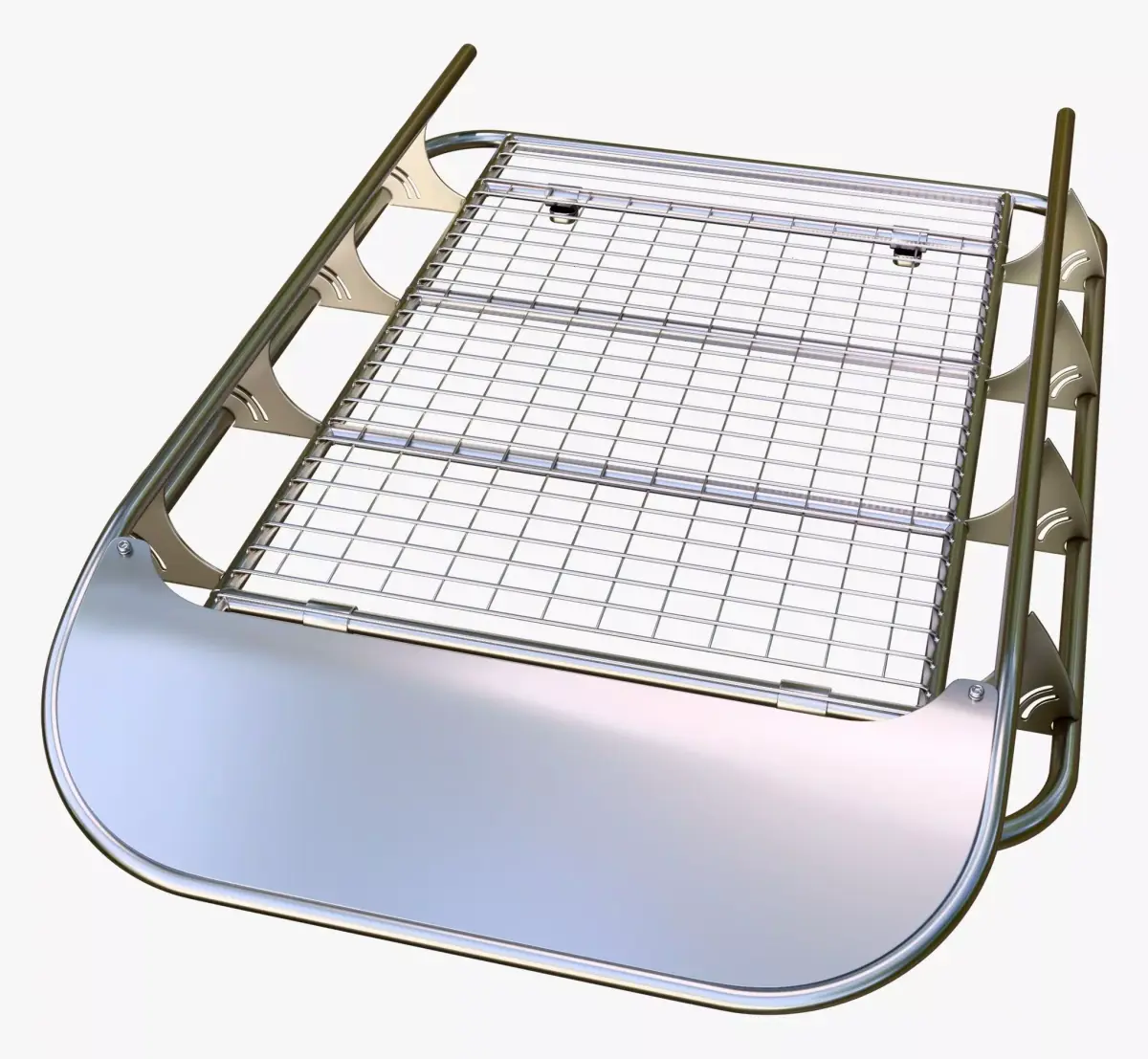 Heavy-duty expedition cargo basket for off-road application. Tubular steel framework equipped with an aerodynamic fairing.