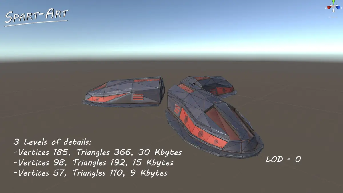- 3 levels of model detail: Model-1 LOD-triangles-366; 192; 110;