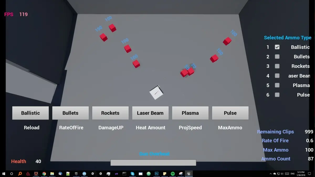 Included 6 weapon types that are using 6 separate ammo types: Bullets, Rockets, Laser Beams, Pulse Lasers, Ballistic projectiles, and Plasma projectiles.