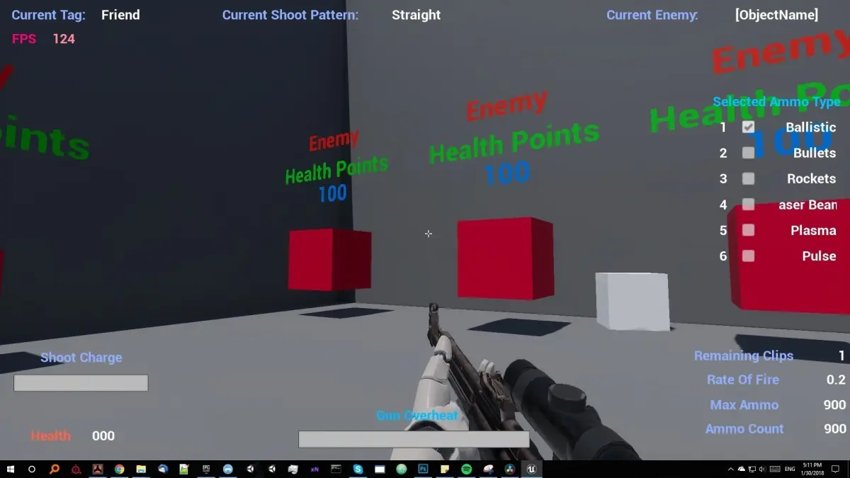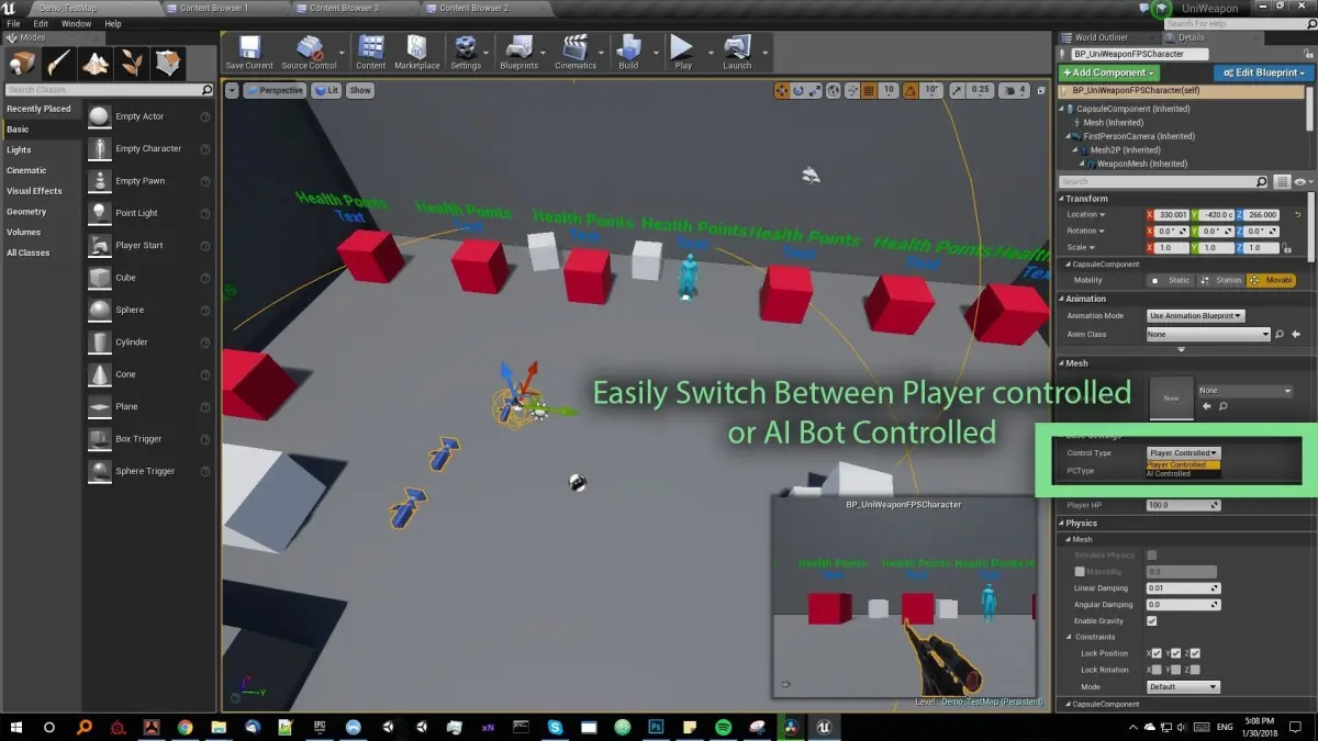 Playable FPS, TPS, or Tower Defense CharacterPre-set 6 weaponsPre-set 6 ammo typesData Table for easy add or edit weaponsEnemy and Friend ActorsNumber of Blueprints: 12Input: Mouse and Keyboard are preconfiguredNetwork Replicated: NoSupported Development Platforms: PC, MAC, LINUXSupported Target Build Platforms: PC, MAC, LINUX, CONSOLESDocumentation: https://docs.google.com/spreadsheets/d/1VOwXO5b8k_HoknBzaRCWzwiik6mZ4Z_dd7siPhBg9gs/edit?usp=sharing