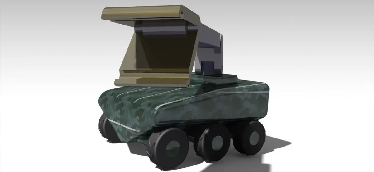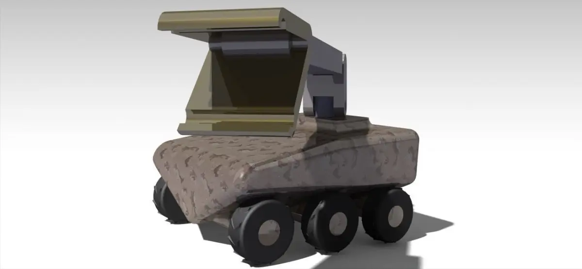 The model is a Unmanned Ground Vehicle (UGV) rover drone with a robotic arm. The arm has active kinematic joints can be simulated using the native CAT file. The moving functions are visible in youtube preview.
