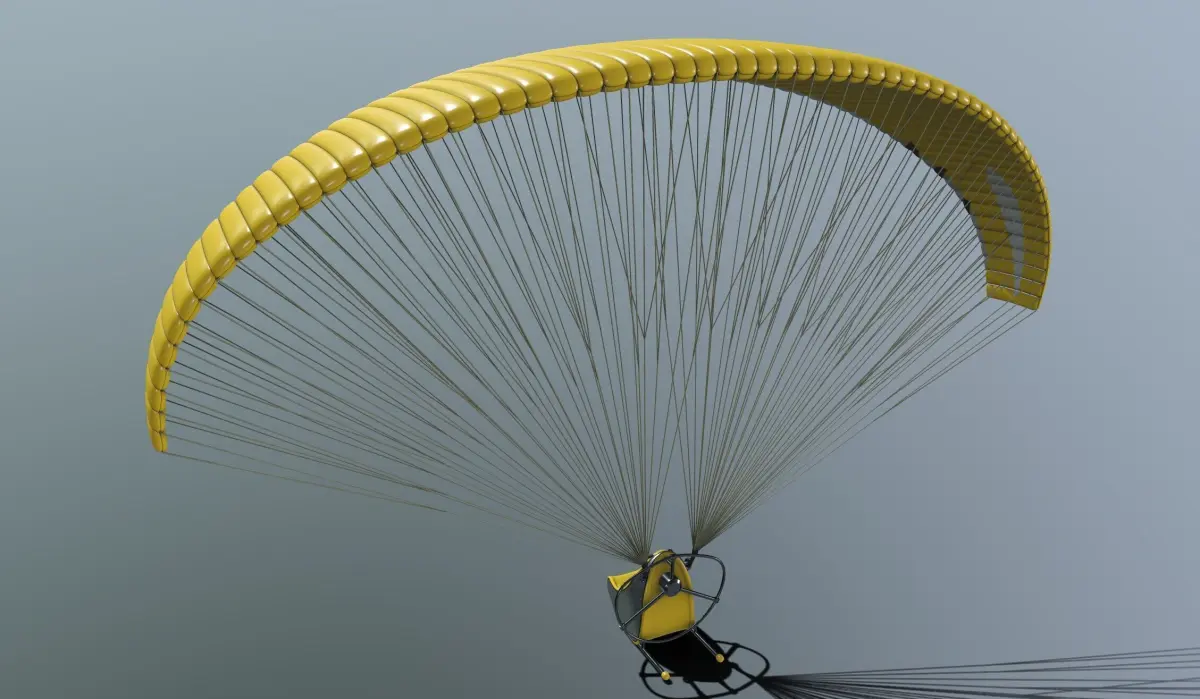 An unpowered paraglider showcasing a canopy in a bold yellow shade, constructed with high-quality materials for stability and control, ensuring a thrilling and safe flight in the current timeline.