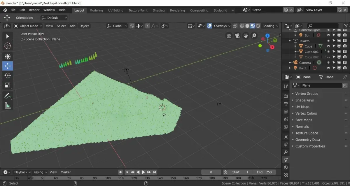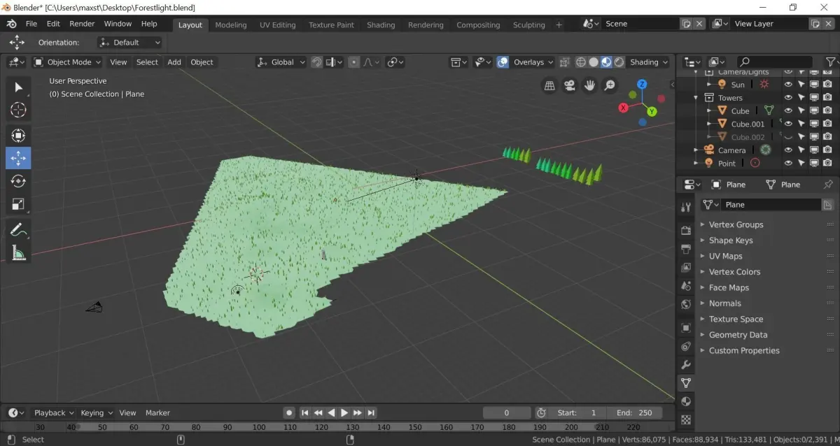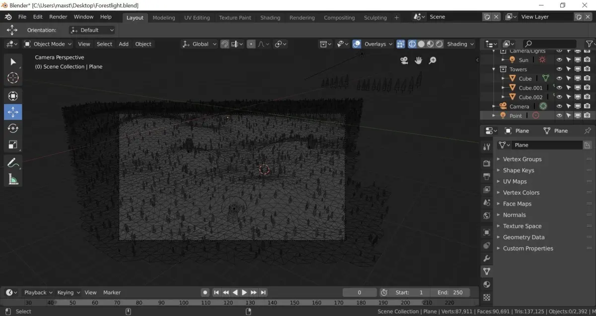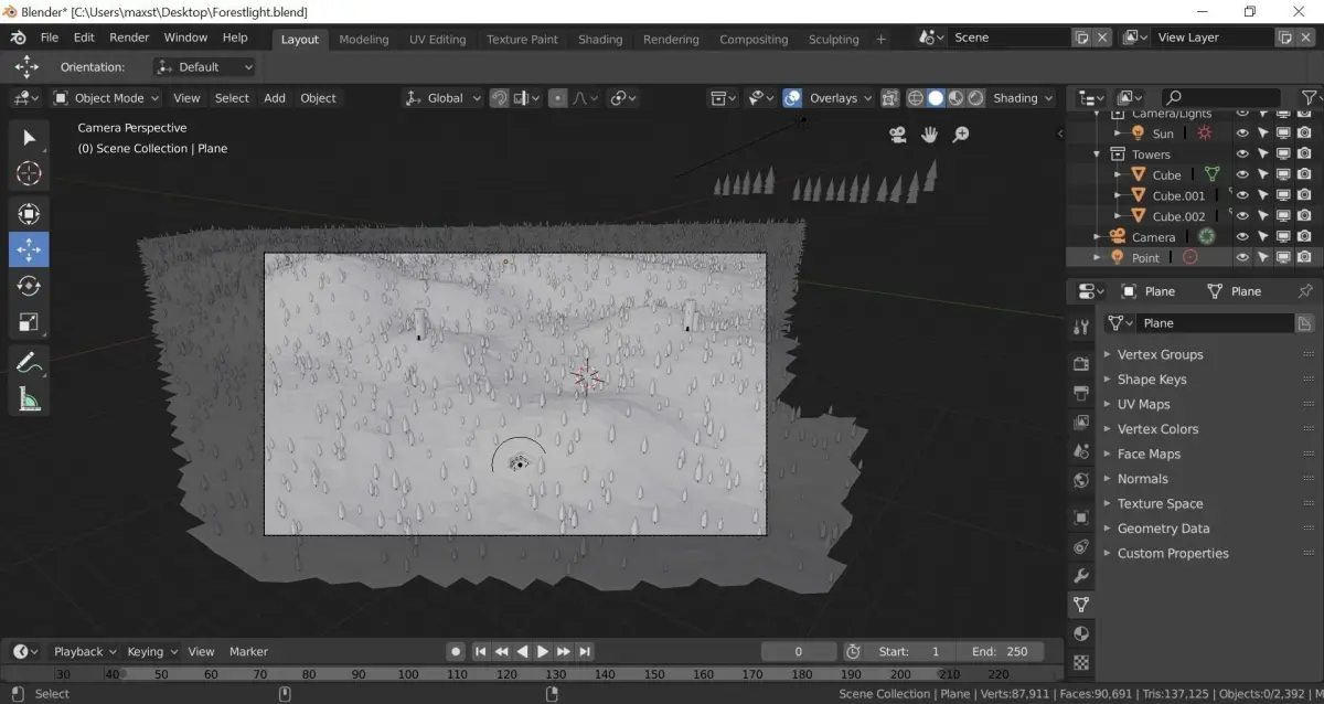 A low poly forest scene. A secret tunnel glowing red avoiding 2 watchtowers. A nice blend of red (the flags, the glow of the tunnel and the setting sun) and green (the forest and the ground).