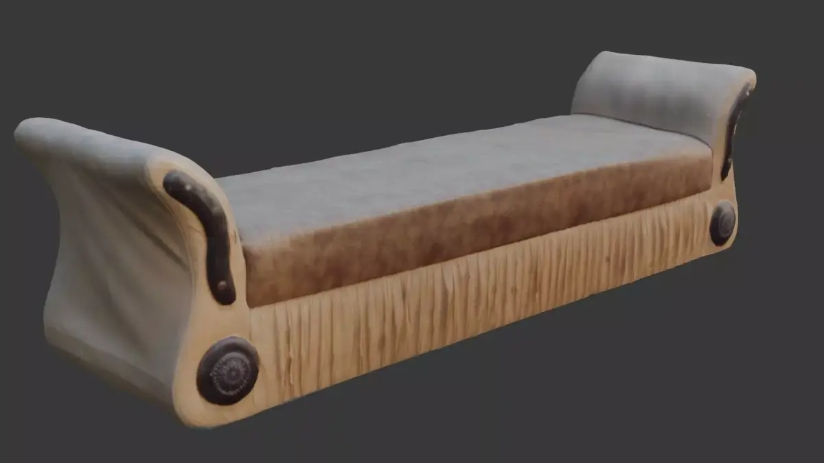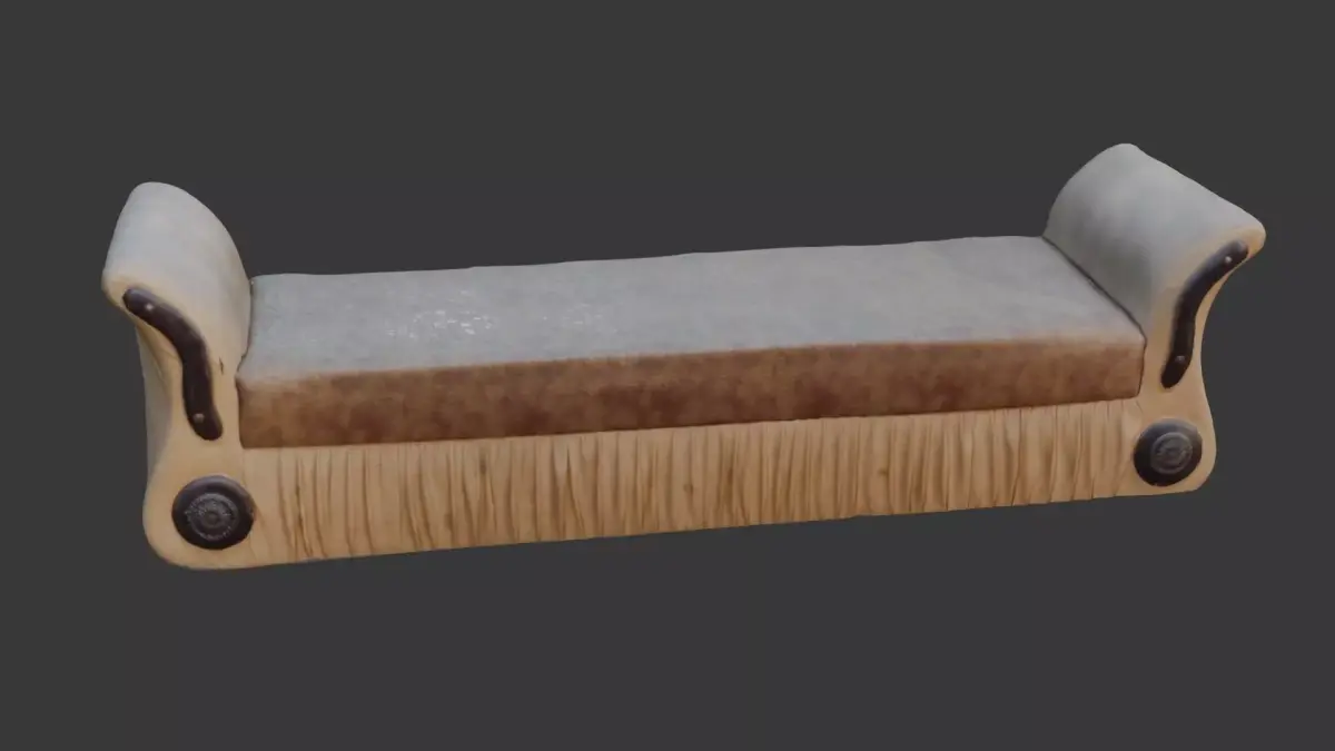 Highly detailed 3D scan of an upholstered bench seat with curved armrests and visible fabric texture. The model includes two variations: one with a plain fabric base and another with a fringed detail. Ideal for interior design projects, furniture visualization, or historical settings. The model is provided in multiple formats (BLEND, FBX, OBJ, GLB, USD, STL) and includes 4K PBR textures for seamless integration in any pipeline.