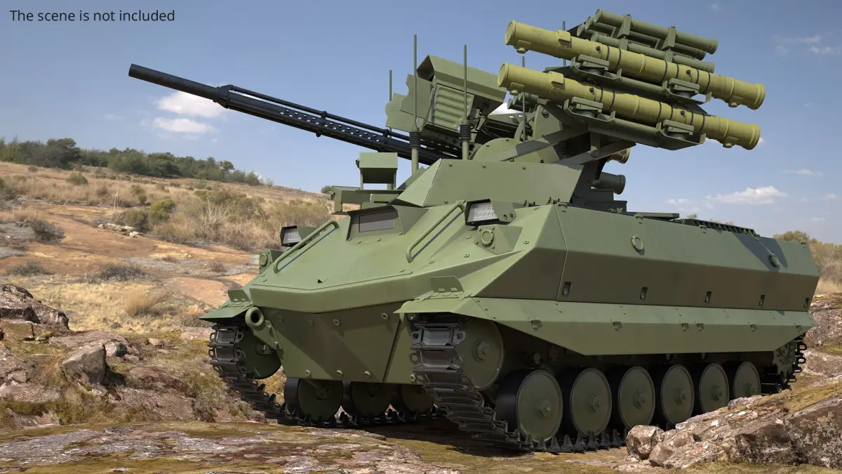 Uran-9 Combat Robotic Vehicle with Missile Launchers Green is a 3d model of a modern military ground vehicle, designed for maximum versatility and combat readiness in various terrains.