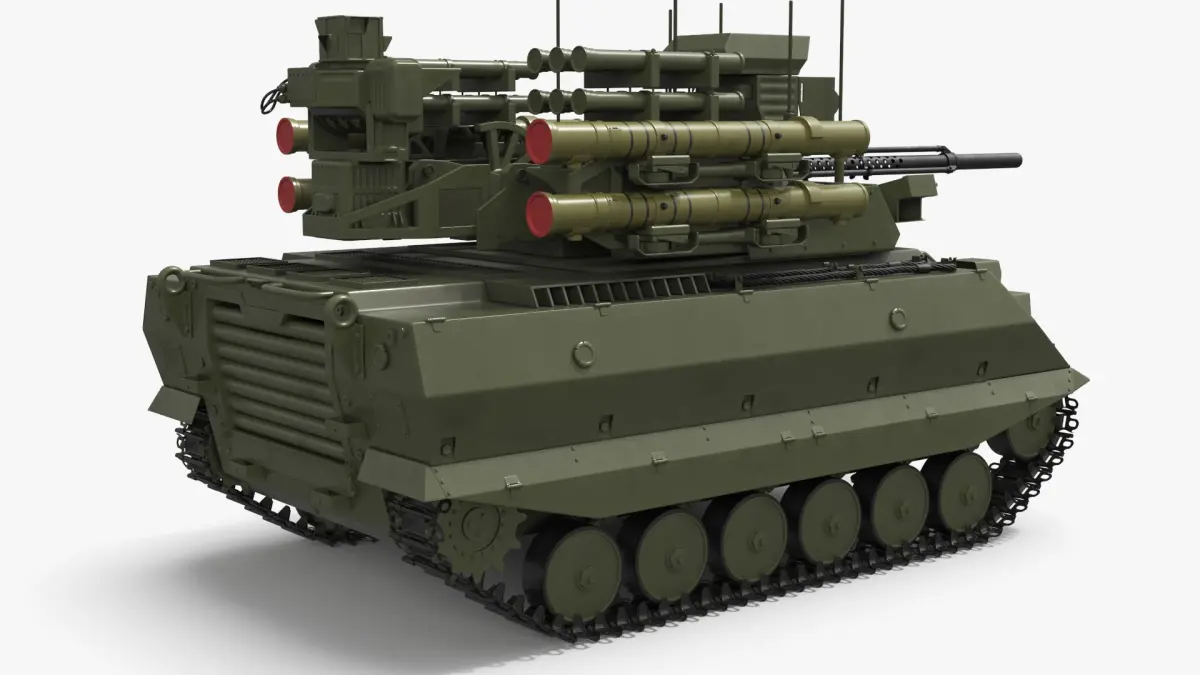 This model showcases a robust construction with mounted weaponry, including missile systems and a machine gun turret. Equipped with advanced armor and tracking systems, the vehicle is optimized for both offense and defense. Its design includes reinforced tracks for all-terrain mobility and antennas for communication and control.