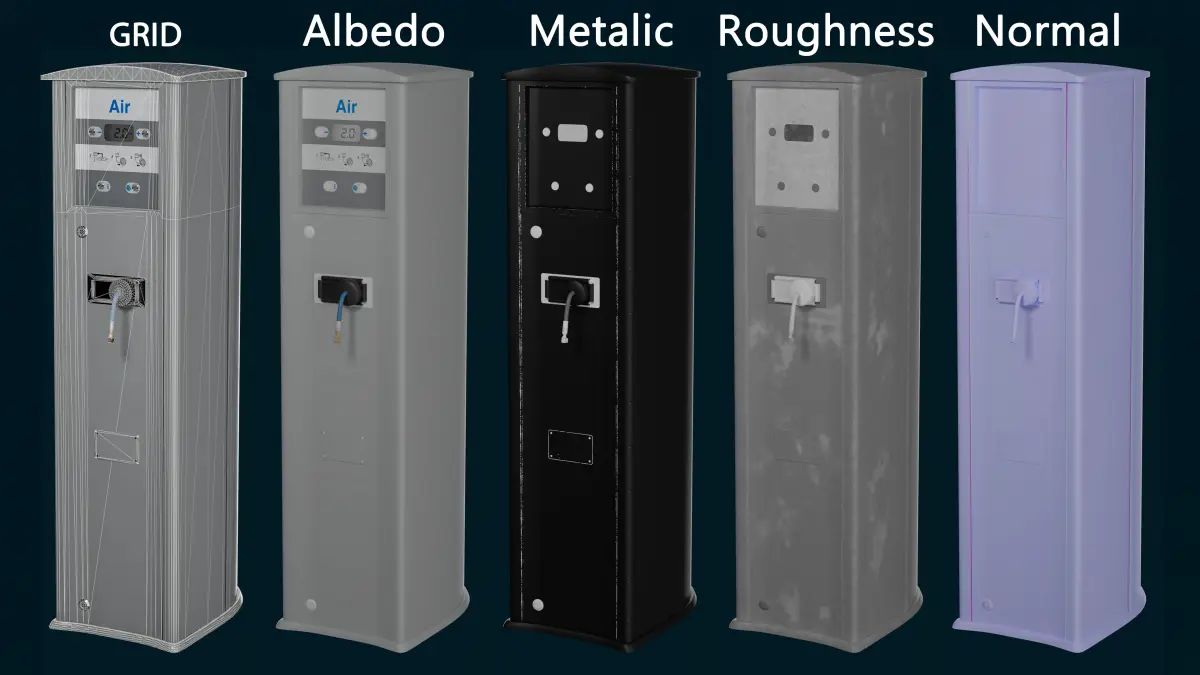 Urban Air Pump Station – Game ready Asset, typically found at gas stations or parking lots. Designed for use in real-time applications such as games, simulations, or architectural visualizations. The model is clean, optimized, and ready for engine integration. This game-ready asset combines performance-friendly topology with high-fidelity textures, striking a balance between realism and real-time efficiency.
