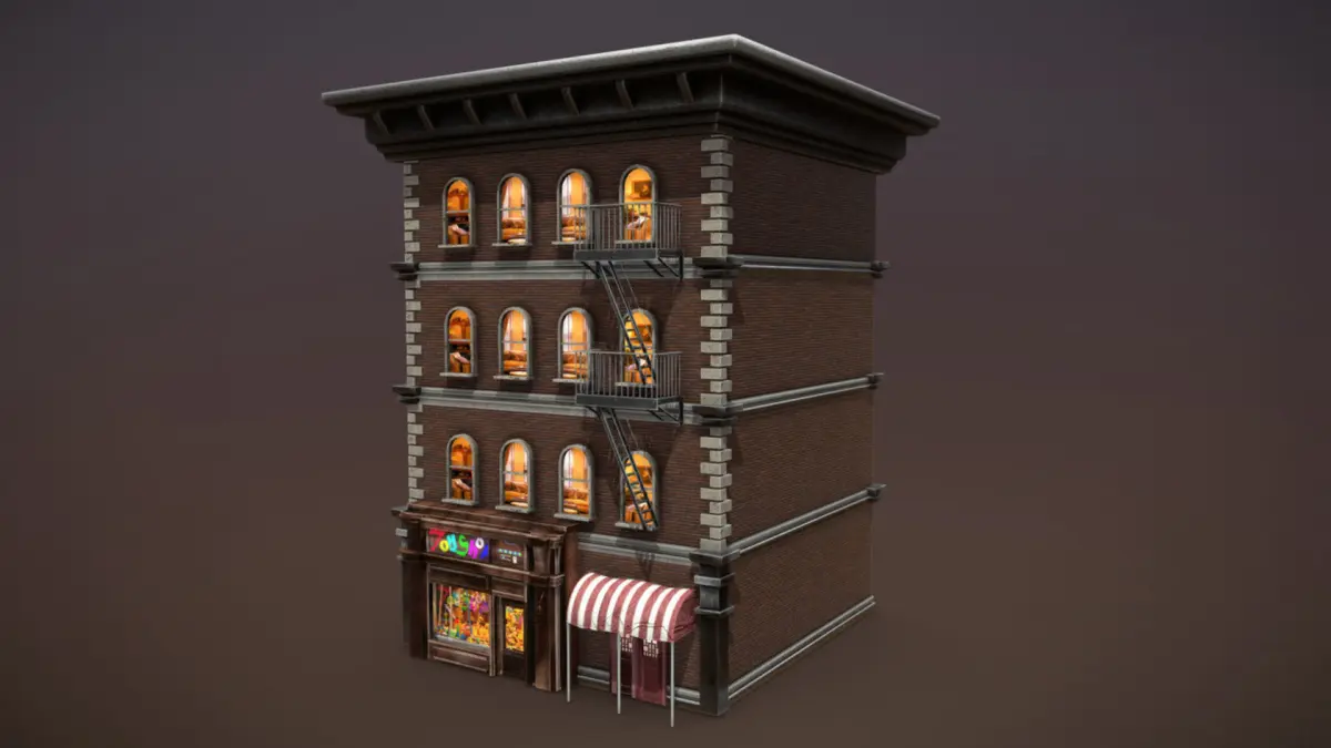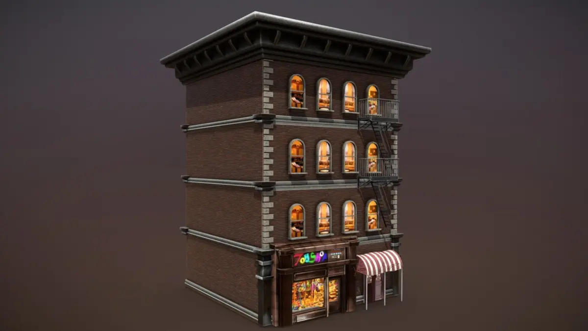 Game-ready building model made from 11 meshes and 20 materials.