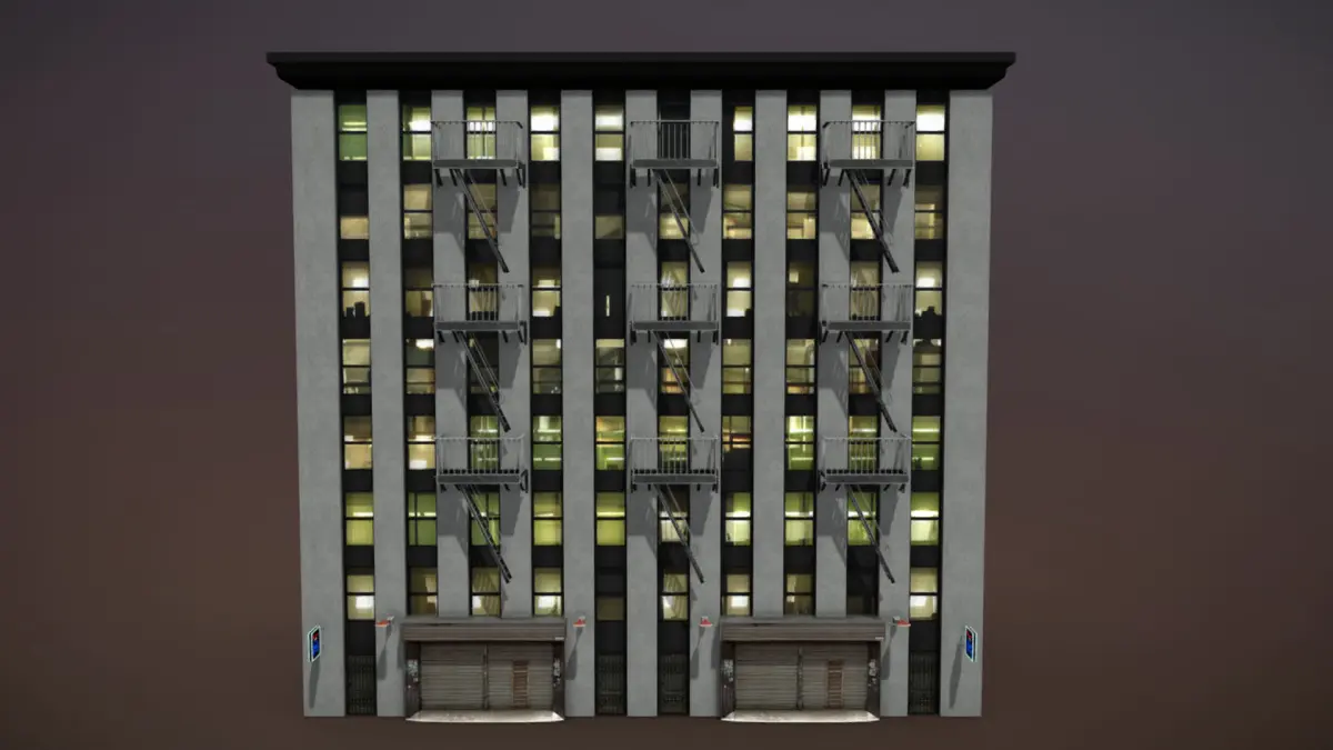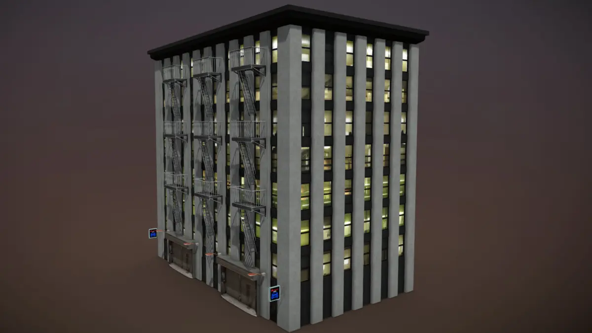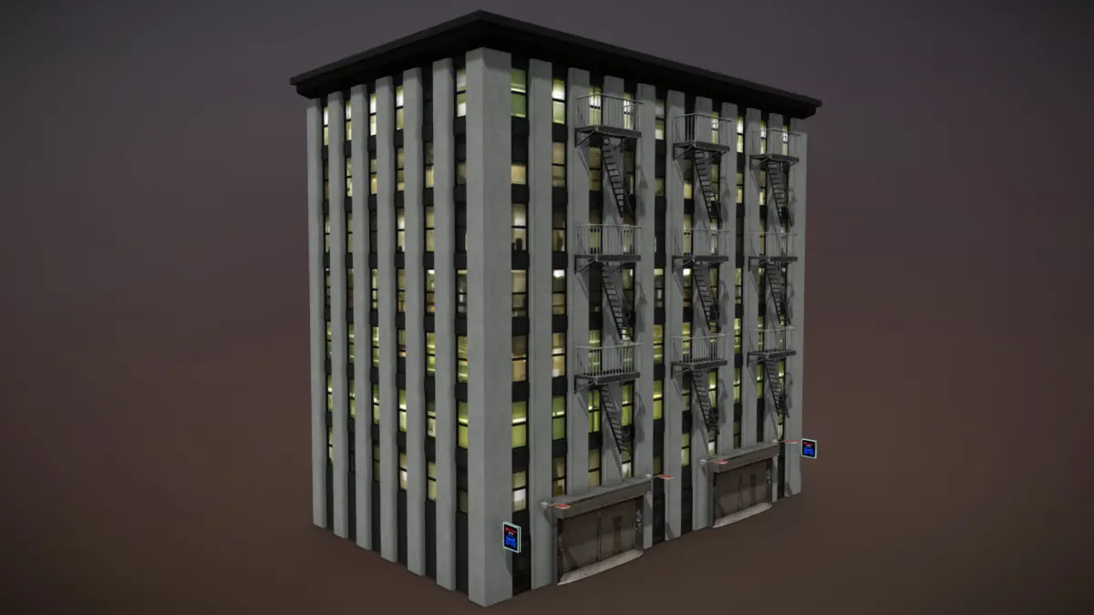 The following meshes are included: building, doors, lamps, garage and fire escape stairs.