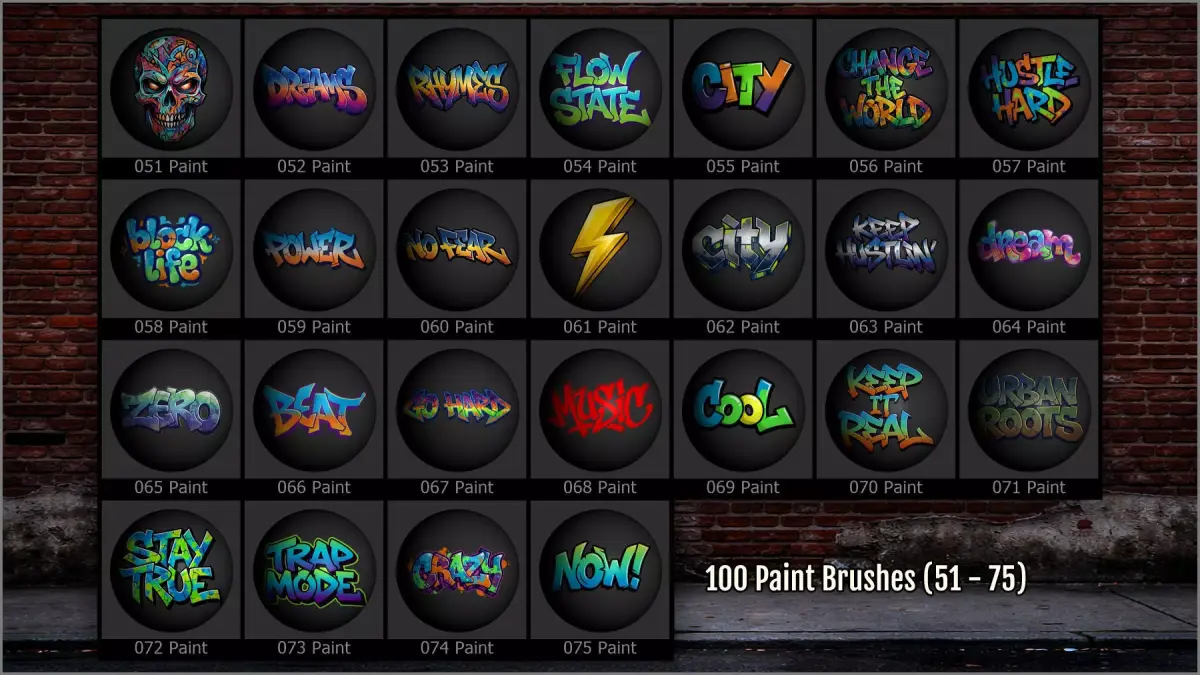 They include a wide range of graffiti tags, throw‑ups, stencils, stickers, expressive lettering, bold phrases, street symbols, and urban graphics, perfect for giving your scenes a gritty, lived‑in, and contemporary look.