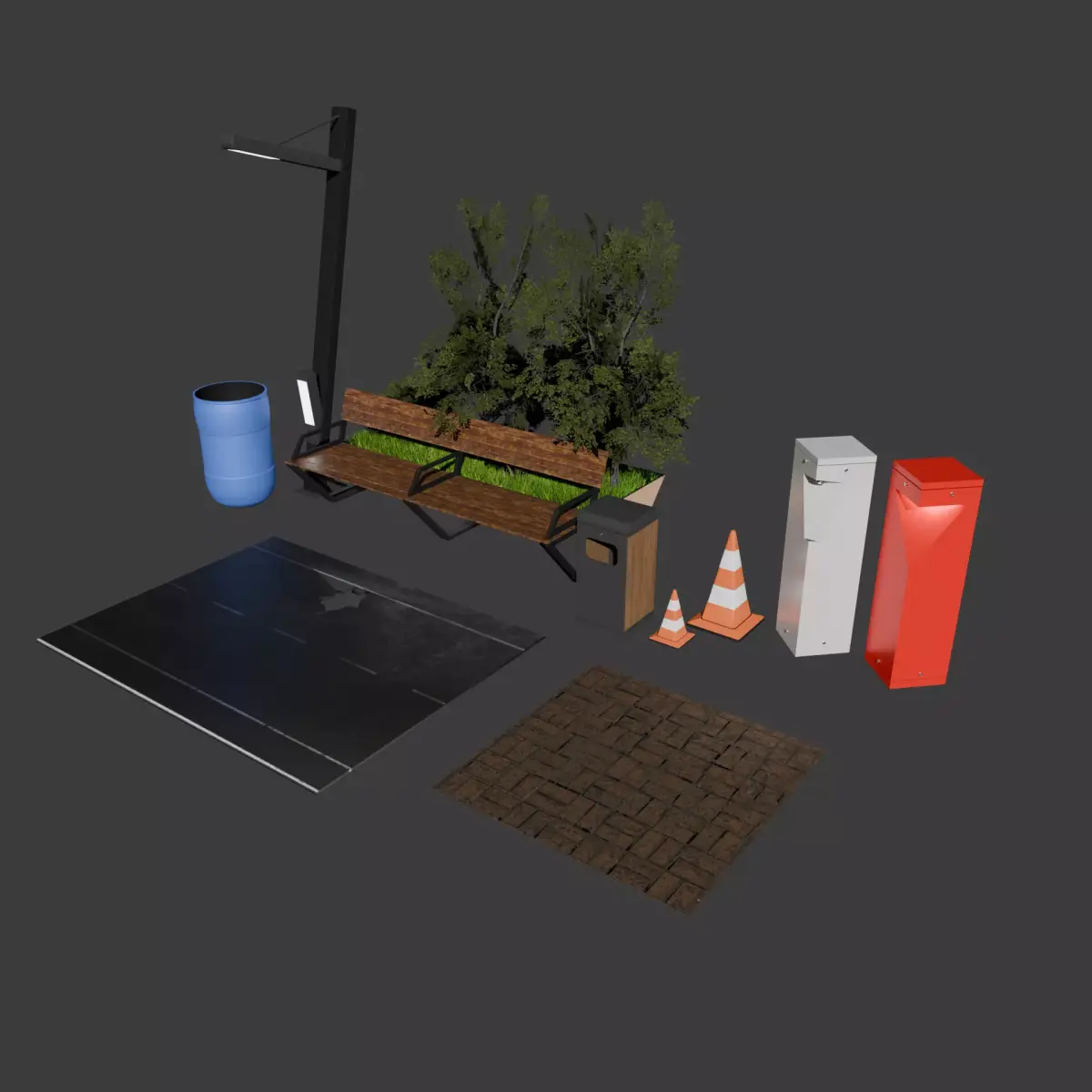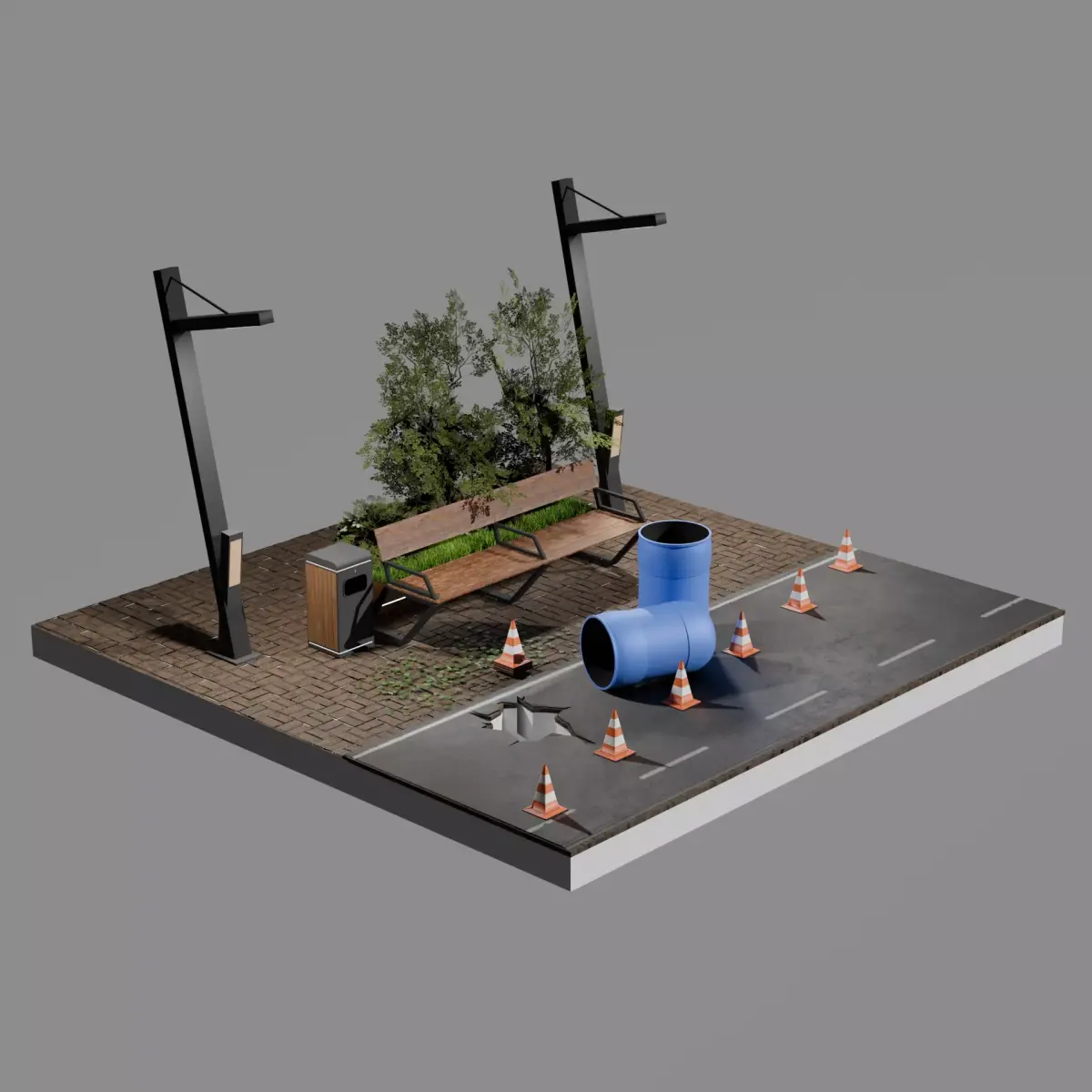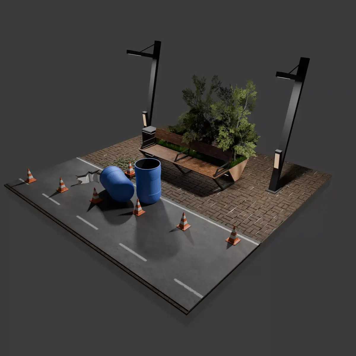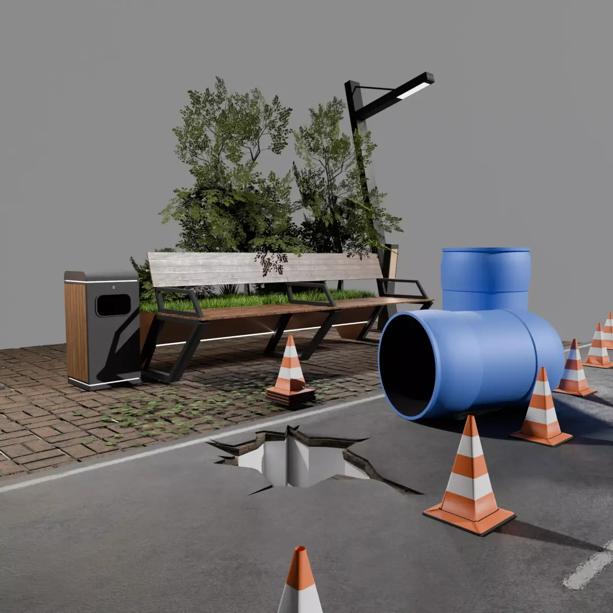 This high-quality 3D urban environment bundle features a realistic street scene perfect for architectural visualization or game development. The collection includes meticulously textured assets: a modern wooden park bench, a sleek contemporary trash bin, a stylized street lamp, lush greenery, and essential road construction elements like safety cones and large utility pipes.The scene is highlighted by a detailed asphalt road with a realistic pothole, demonstrating the high level of surface detail. This URBAN DESIGN BUNDLE - COMBO PACK is an ideal all-in-one solution for creators looking to populate digital cityscapes with professional, render-ready assets.