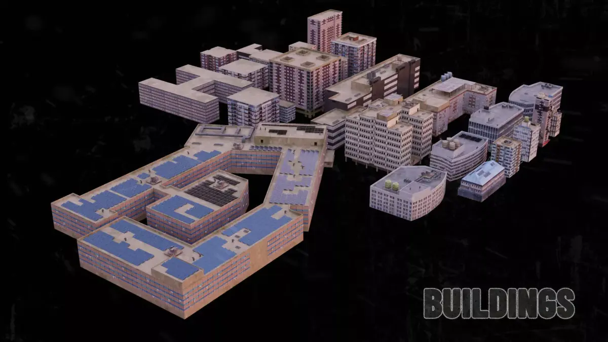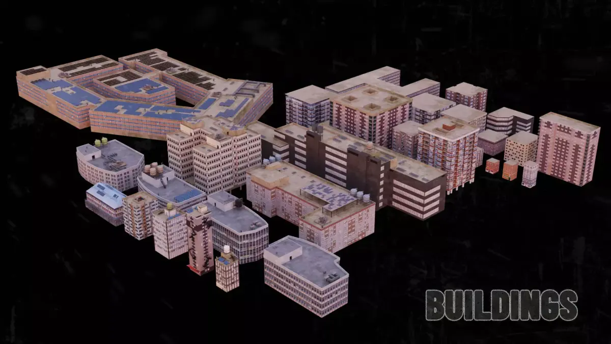 - A selection of fully built city structures, optimized for direct use. - Consistent scale and style for seamless placement in a city scene. - Ideal for quick environment setup without needing modular construction.