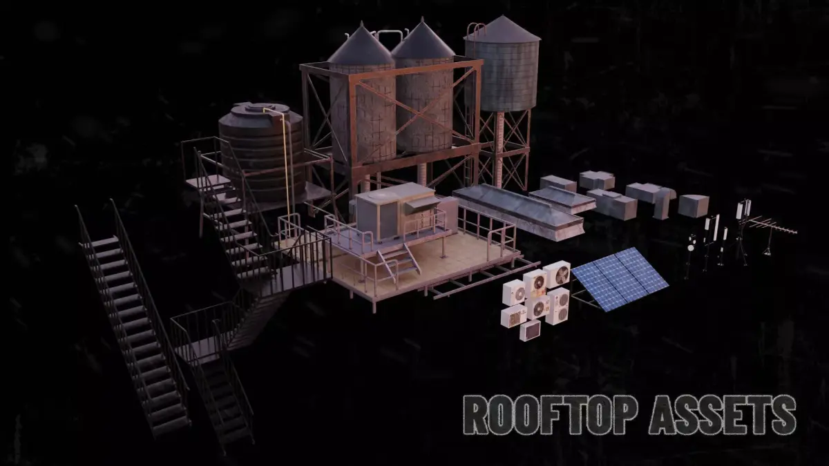 - HVAC units, water tanks, ducts, vents, satellite dishes, antennas, and other common rooftop details. - Designed to fit naturally on the provided buildings or your own custom structures. - High-quality models that enhance believability and storytelling.