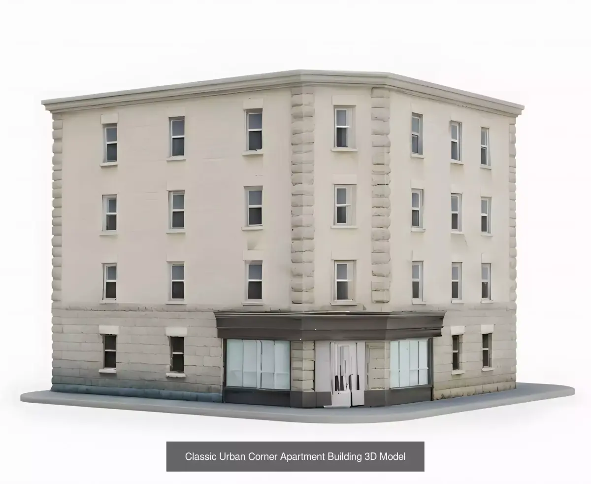 Classic Urban Corner Apartment Building: A traditional mid-rise building designed for street corners, featuring brickwork and standard window layouts.