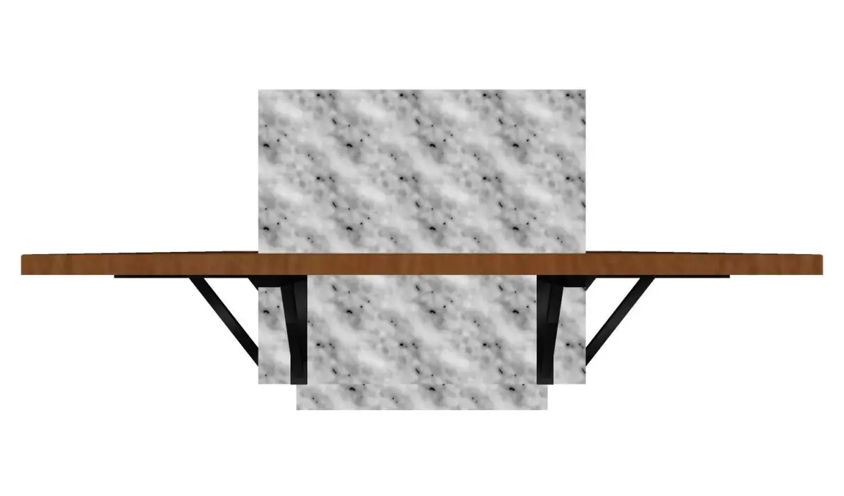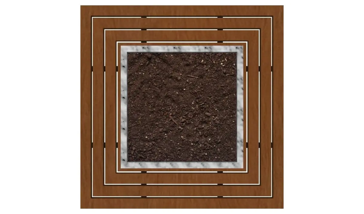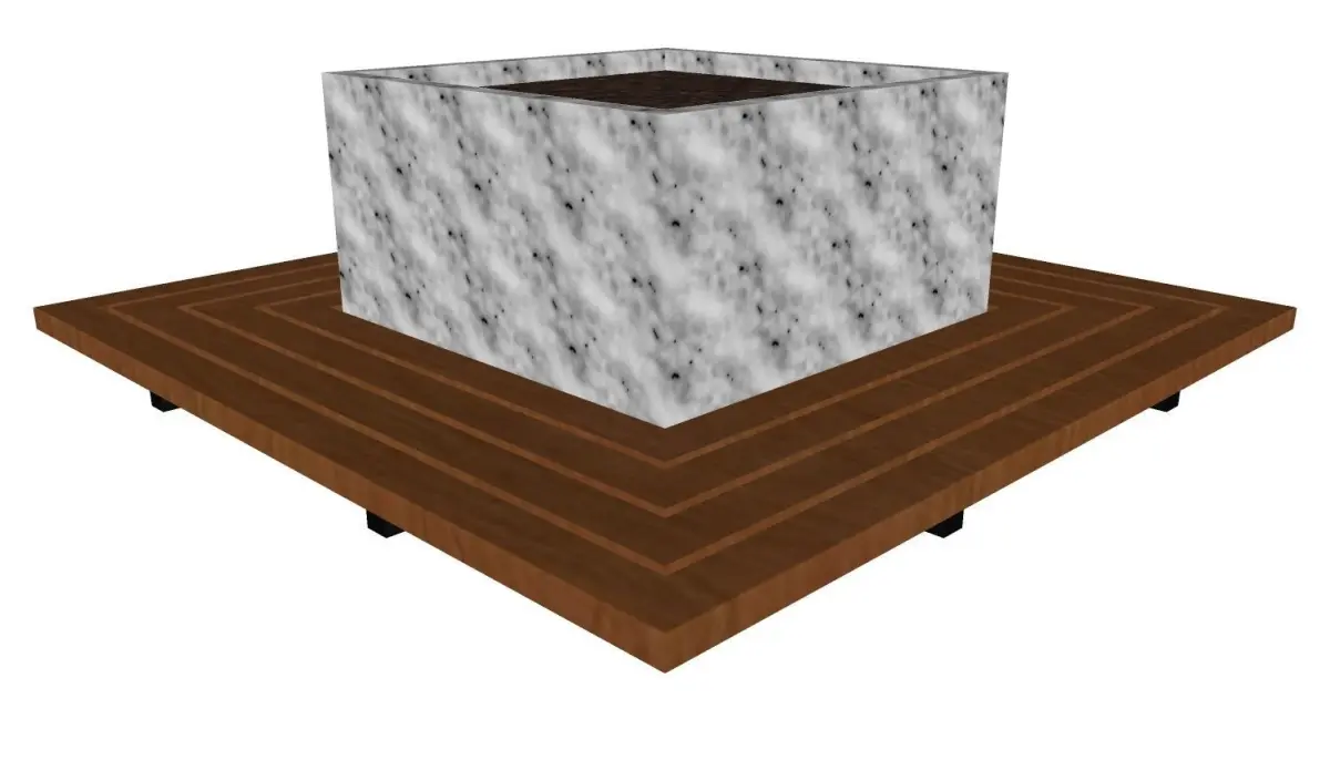 Park bench, with concrete base and wooden seat. It has a space in its center for planting flowers and medium-sized plants.