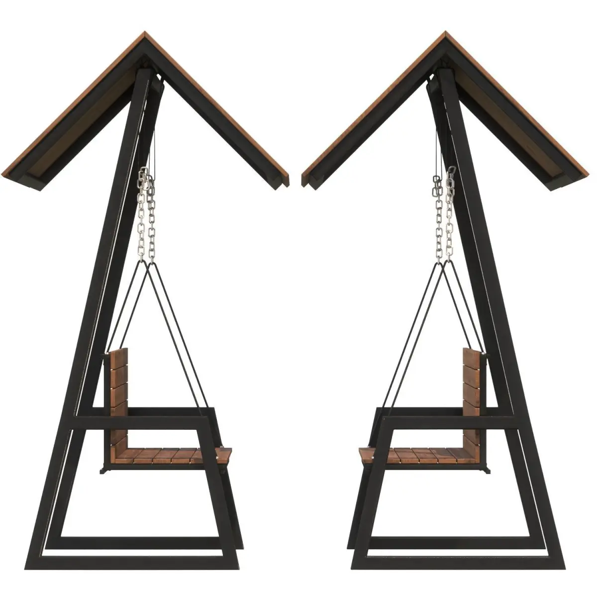 This stylish and functional swing bench is designed for urban outdoor environments such as parks, patios, or private gardens. The model features a modern A-frame structure with a pitched roof for shade and weather protection. The seat is suspended with metal chains and includes a slatted wood design for comfort and breathability. The frame is made of black-coated metal, adding contrast and durability to the piece.