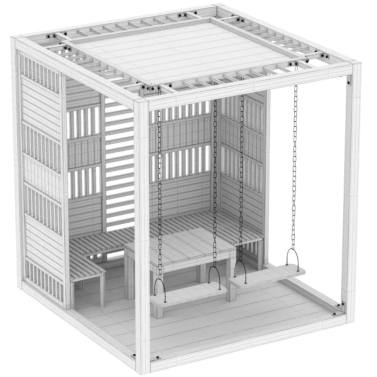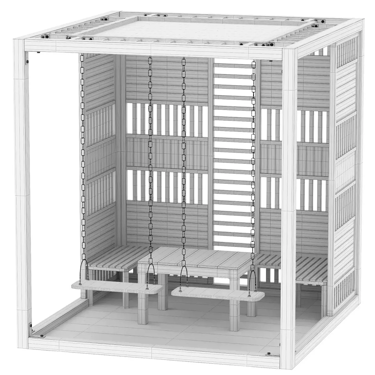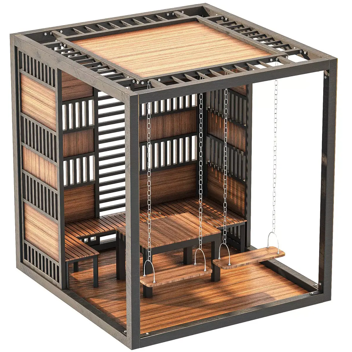 The model includes two suspended wooden swings attached with metal chains, a central wooden bench, and integrated side seating, making it ideal for social areas and contemporary outdoor environments. The modular side panels are designed with rhythmic vertical and horizontal slats, offering both privacy and controlled visibility while allowing natural light to pass through.