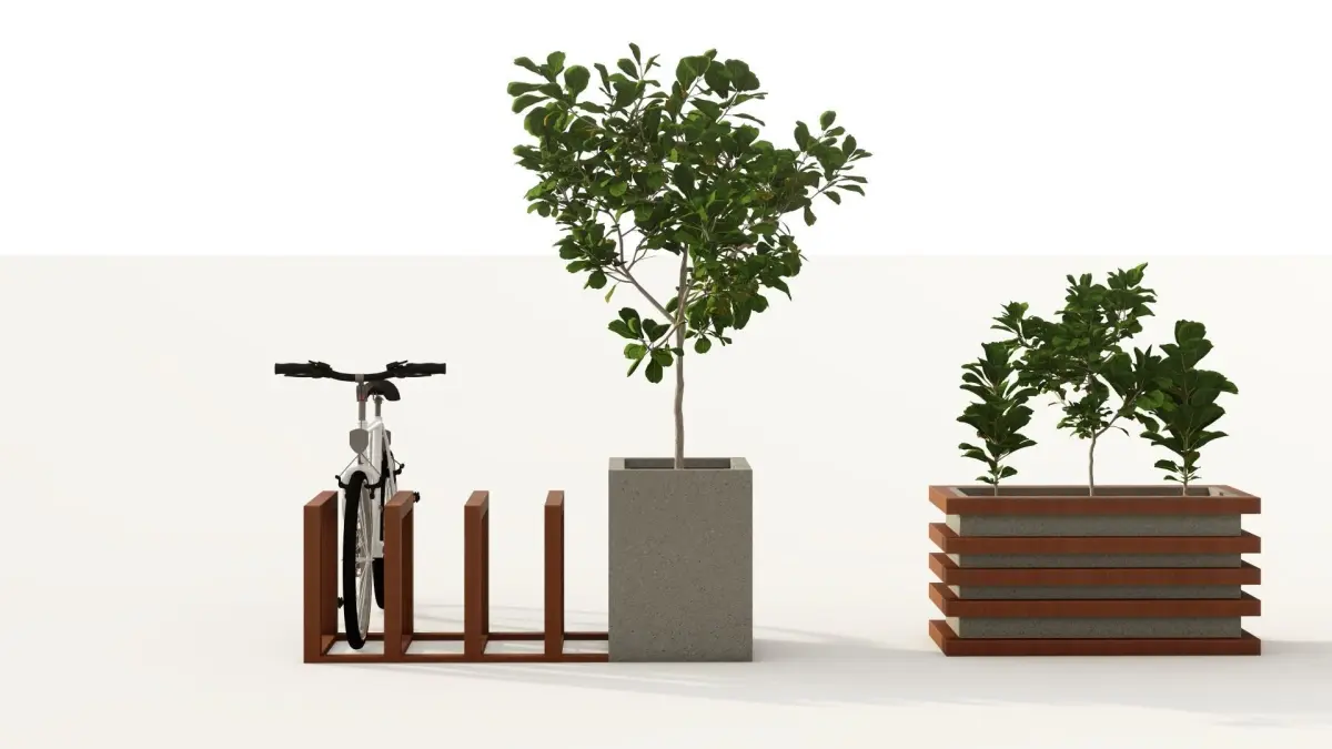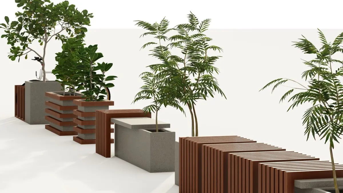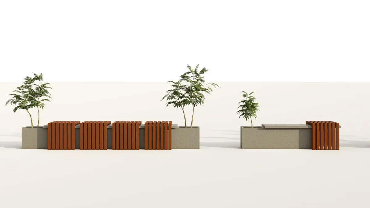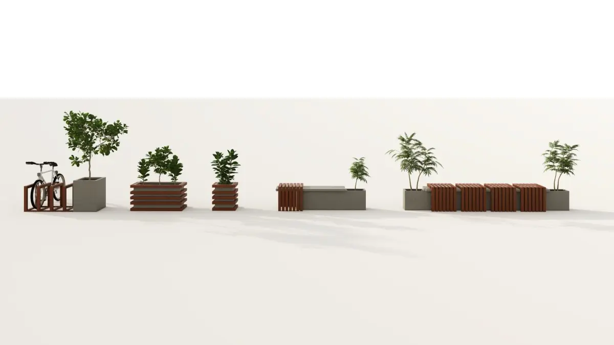 Bench set with minimal design. You will receive 2 types of bench % planter and cycle parking models.