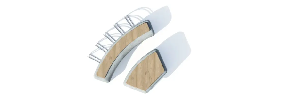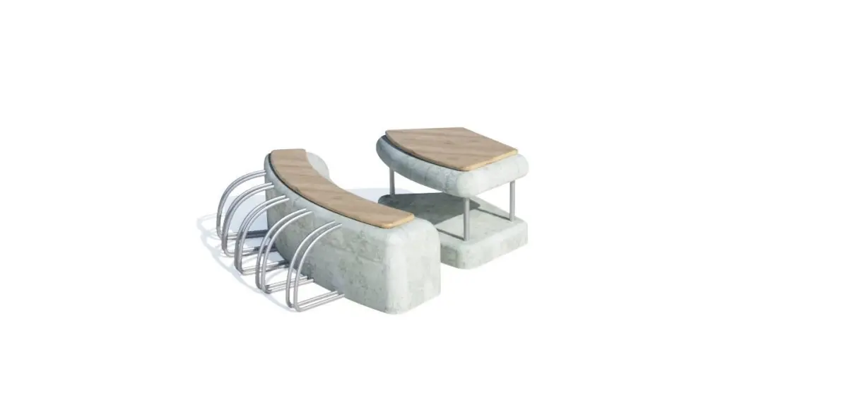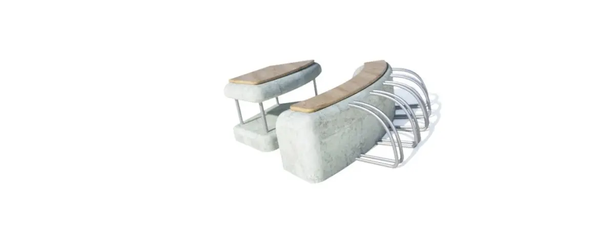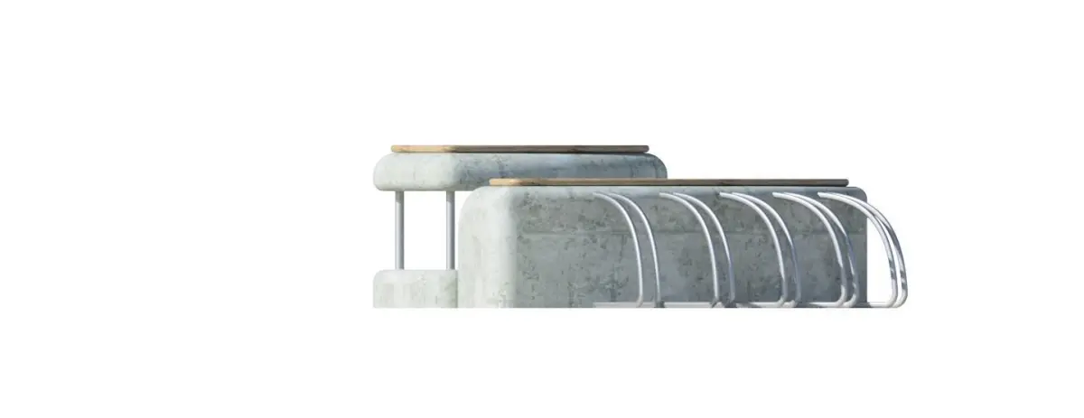 Made from concrete, steel and wood. Is designed to be used in an urban setting. Provides storage for 5 bikes. Has surfaces for sitting and dining. With personal item storage under the dining space.