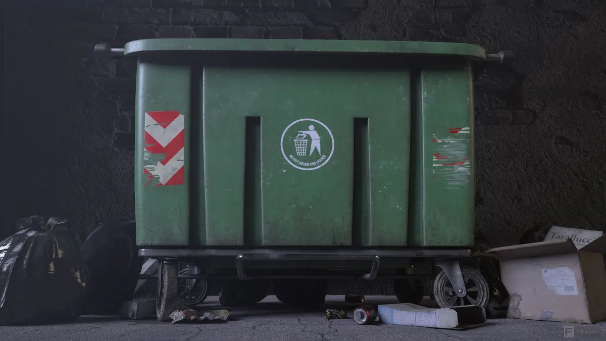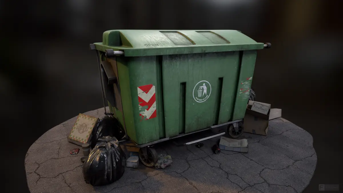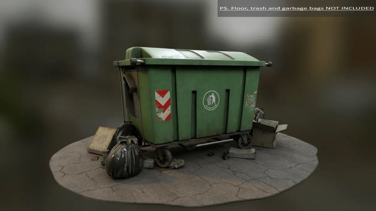PS. For demostration purposes, I added some trash, a floor and a few garbage bags. Remember that they are NOT INCLUDED: the dumpster with its textures is the only product to be sold.