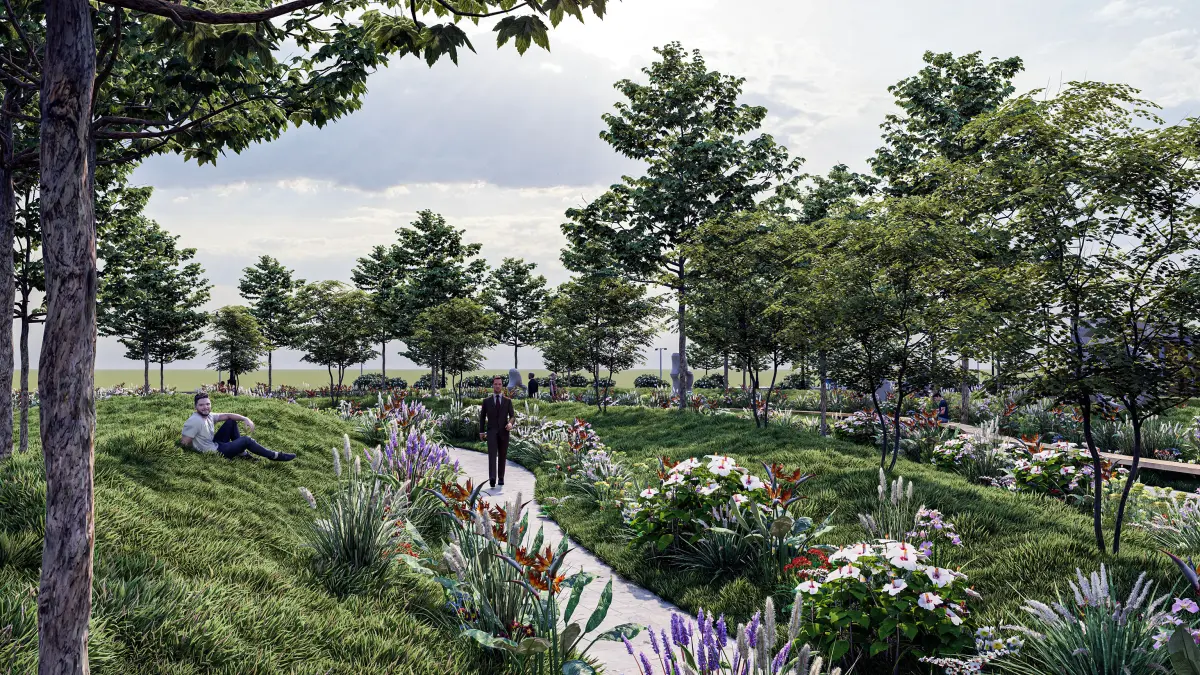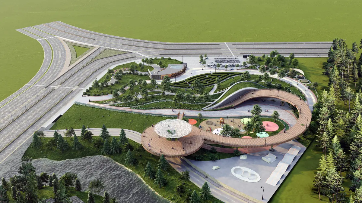 Allowed for the commercial use This highly detailed and professionally designed 3D model represents a modern landscape architectural park, perfect for urban design, public space planning, and environmental visualization projects. The layout integrates a dynamic mix of natural and recreational elements including a children’s playground, observation deck, walking trails, labyrinth maze, floral gardens, and terraced green areas, all surrounded by a lush forest backdrop.A distinctive circular elevated wooden walkway serves as the central design feature, guiding visitors through the park’s key zones and offering an immersive experience above ground level. The design harmoniously connects with the adjacent river, offering a serene waterfront path ideal for pedestrians and cyclists.The model also incorporates realistic road infrastructure: a multilane highway with designated turn lanes, street lighting, crosswalks, and pedestrian sidewalks—making it ideal for contextually rich cityscape or suburban development renders.