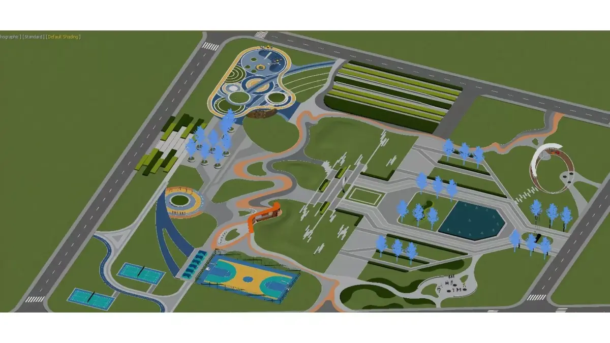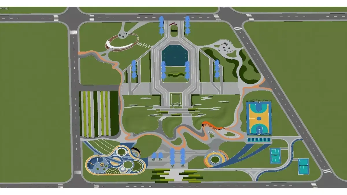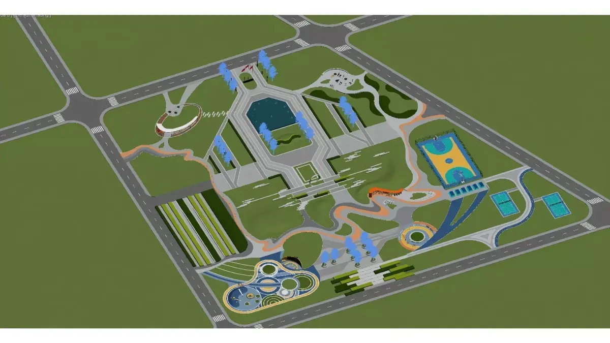 This is a landscape planning drawing of a modern urban comprehensive park, integrating multiple functions such as sports, leisure and ecology. It includes sports areas like basketball courts, tennis courts and swimming pools, paired with an age-friendly children's playground and leisure trails. Meanwhile, through elements such as green landscapes, waterscape nodes and themed squares, it creates a practical and aesthetically pleasing public open space that meets citizens' diverse needs for daily fitness, parent-child leisure and outdoor relaxation.