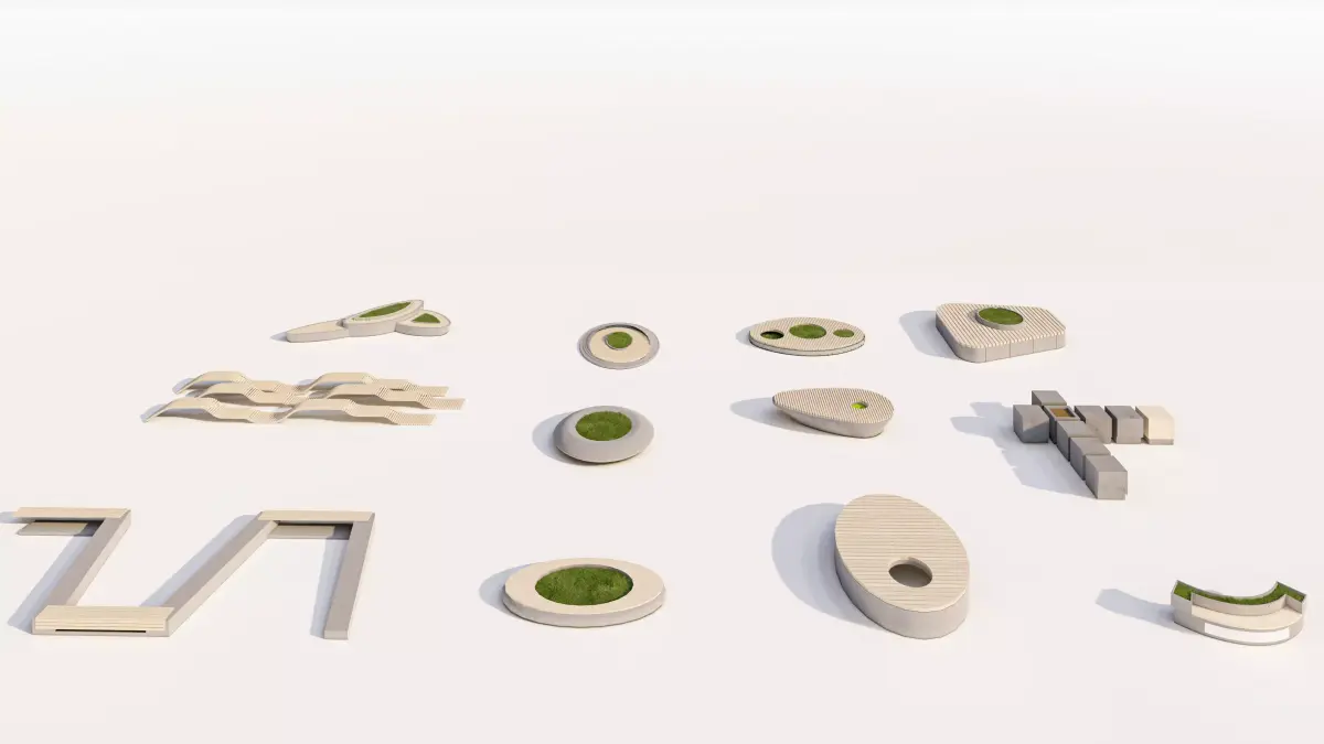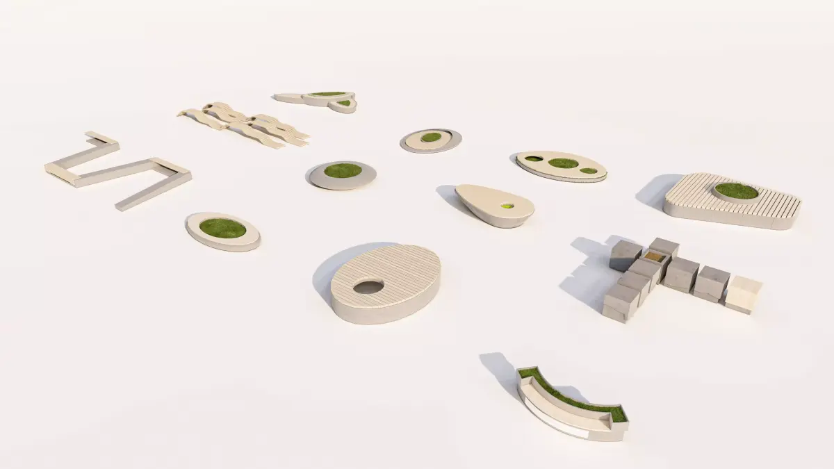 Integrated Planters: Several modular pieces include integrated grass patches (shown as small elliptical or circular forms), allowing designers to seamlessly blend hardscape and softscape elements.