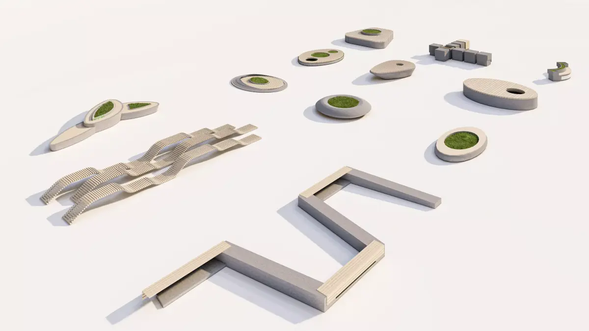 Seating Benches: Features various forms of benches, including straight, curved, and wave-like shapes. Many benches are constructed from light-colored concrete or stone with horizontal wooden slats embedded into the tops for comfortable seating.