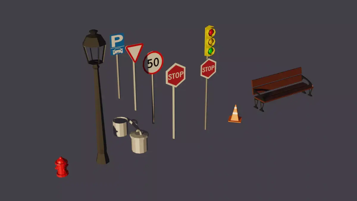 This asset pack includes a collection of stylized low poly urban props designed for game development. The models feature a clean, colorful aesthetic that fits a wide range of projects, from indie games to stylized environments.