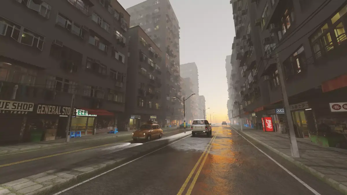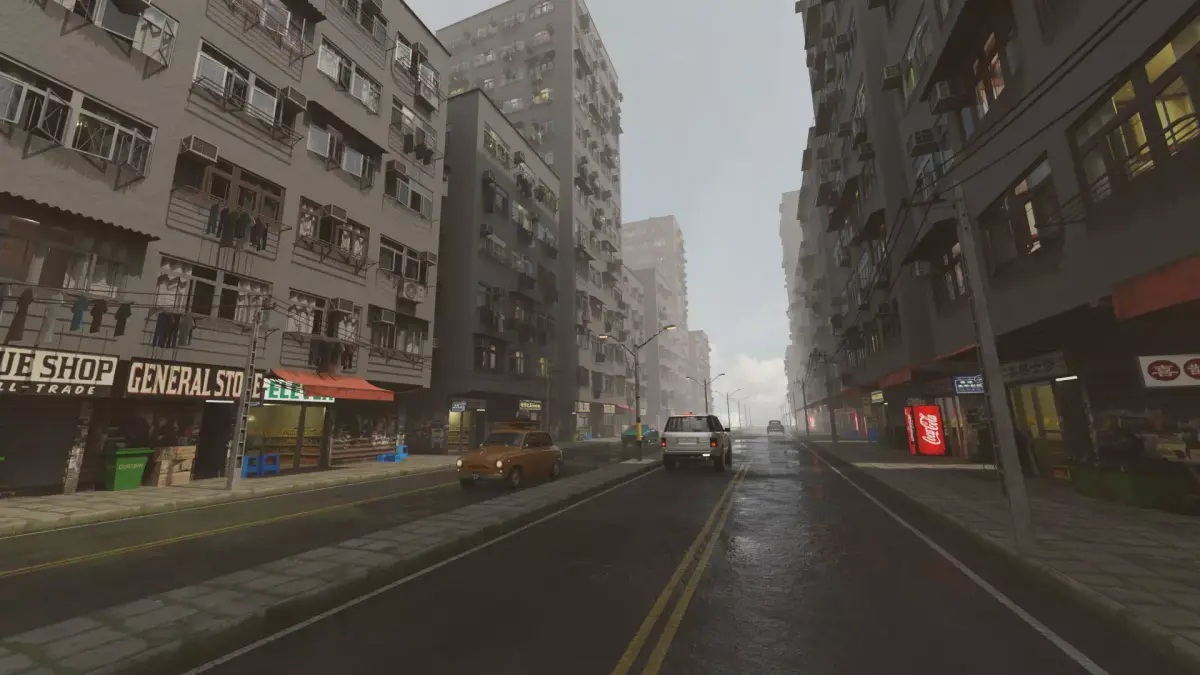 - Realistic street and shop elements: Wet roads, sidewalks with moss, storefront signage, and vending machines provide authenticity.